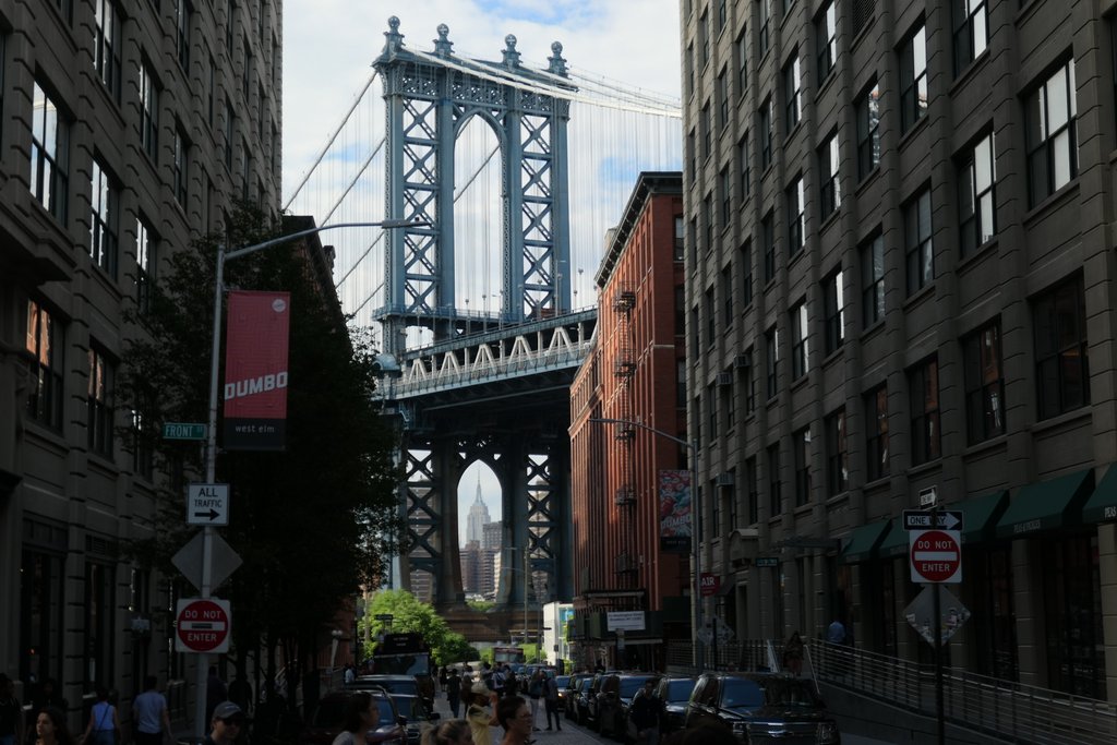 Я специально сходил в тот район, чтобы снять этот вид на новую мыльницу. И специально отошёл подальше, чтоб Эмпайр Стейт практически заполнил всю высоту подъарочного проёма Манхэттенского моста. Вот что у меня получилось.
