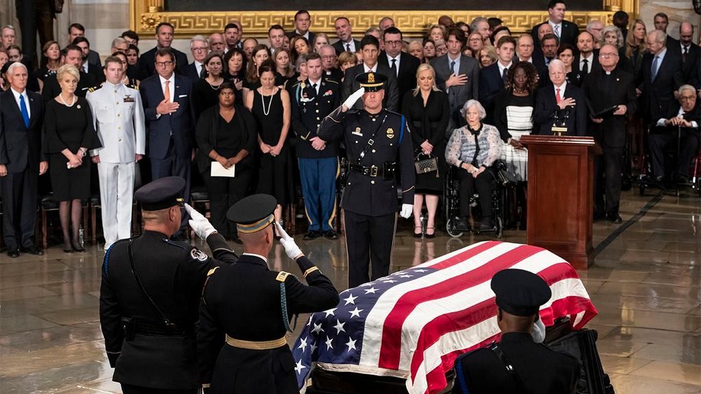 Сегодня в Вашингтоне хоронили сенатора Джона МакКейна, который скончался на прошлой неделе от рака мозга. Болезнь диагностировали довольно давно, и смерть не стала сюрпризом. Последние месяцы жизни МакКейн к ней тщательно готовился. Сегодняшние похороны прошли в большой части по его собственному сценарию. Одной из главных тем этого события стал негласный упрёк в адрес нынешнего президента, хотя его имя во время церемонии старались не упоминать.