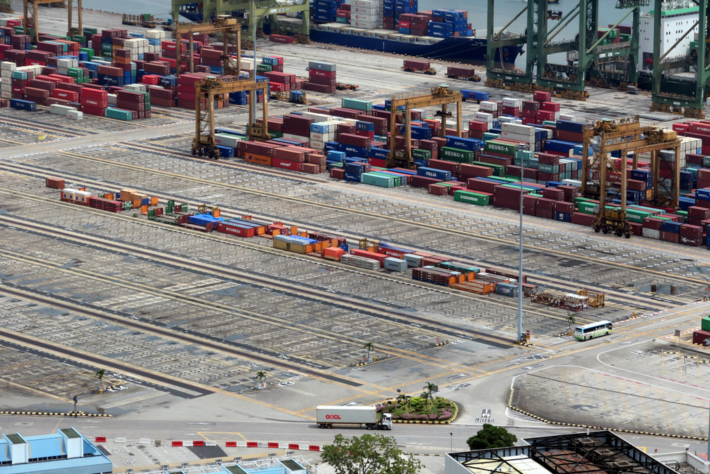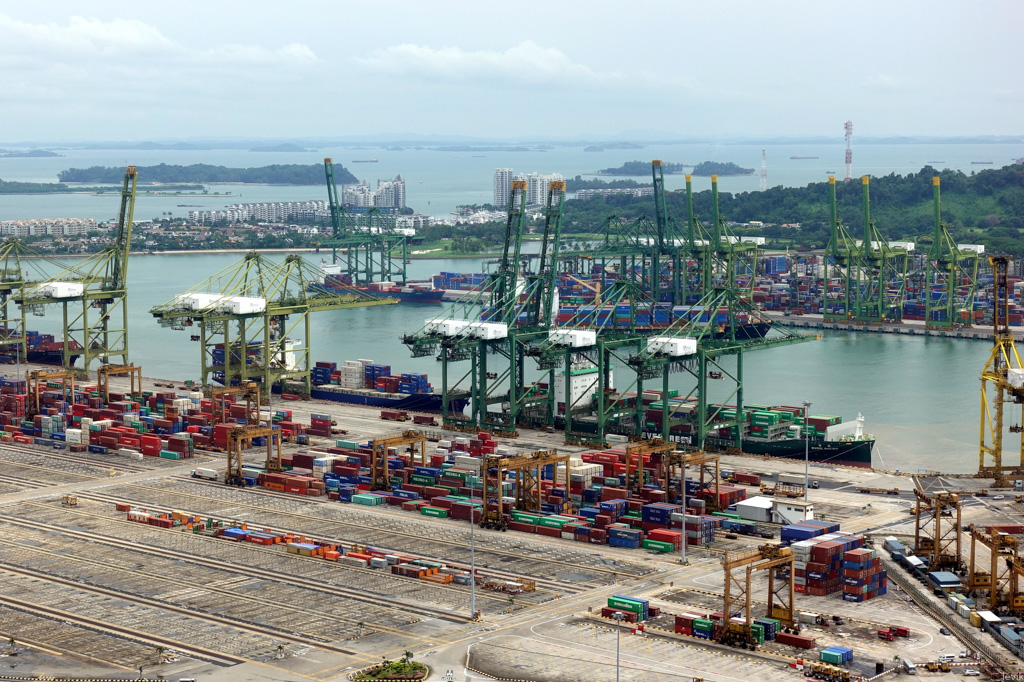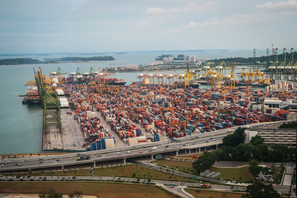 4. Всё это разгружается, хранится, и загружается назад в знаменитом порту Сингапура. До 2005 года это был порт с самым высоким грузопотоком в мире (с тех пор Шанхай обошёл его по некоторым показателям). В наше время порт - значит огромные грузовые краны, и высокие стопки разноцветных контейнеров.