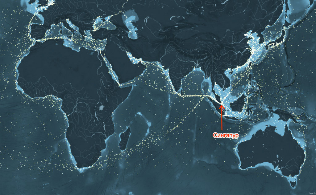 Давайте взглянем на карту грузовых перевозок за 2012 год (это скриншот отсюда, где они ещё и движутся!) Каждая точка здесь представляет собой огромный корабль с товаром. Отчётливо видны популярные пути и направления. Посмотрите, что происходит в районе Сингапура: здесь стекаются и разбегаются несколько очень загруженных торговых путей. Суда из Индии и с Ближнего Востока проходят через Малаккский пролив, огибают Сингапур, и берут курс на северо-восток, в Китай. И наоборот. Огромная часть из них делают в Сингапуре остановку - кто на дозаправку, кто на перегрузку.