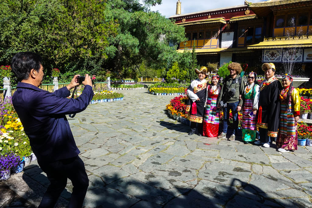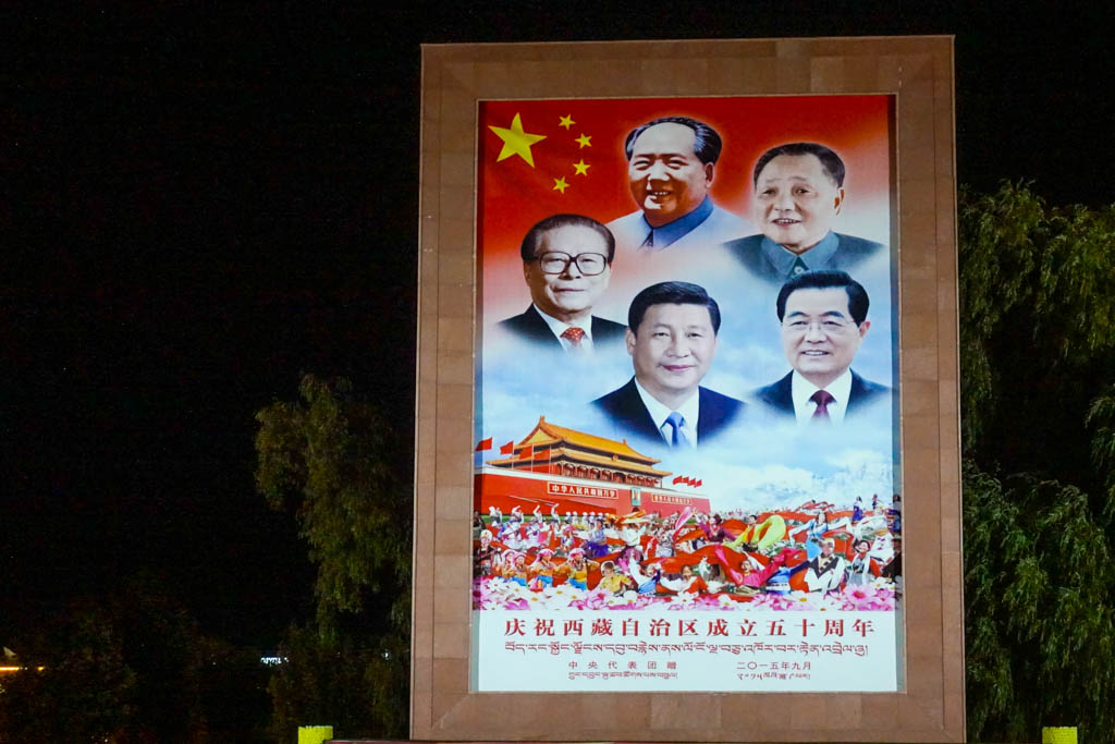 И вот, только мы приехали в Тибет, пошли гулять по главной площади, как очередная группа молодых ребят подбежала с просьбой сделать селфи. (Кстати, при мне Варламов никому в таких просьбах не отказывал!) Сфотографировались на фоне огромного подсвеченного плаката, на котором изображены пять великих вождей Китая.