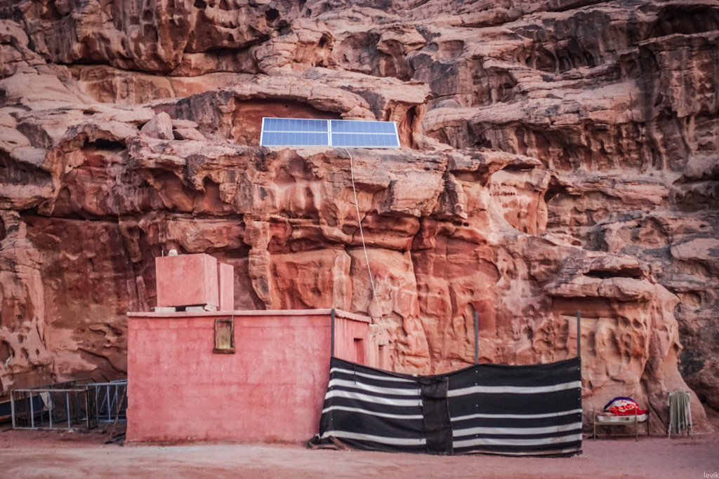 44. В центре пара зданий покрепче - это кухня, души и туалеты (в самих шатрах удобств нету). Конкретно в нашем лагере, продвинутые бедуины установили солнечную панель (но рядом с ней работал и генератор):