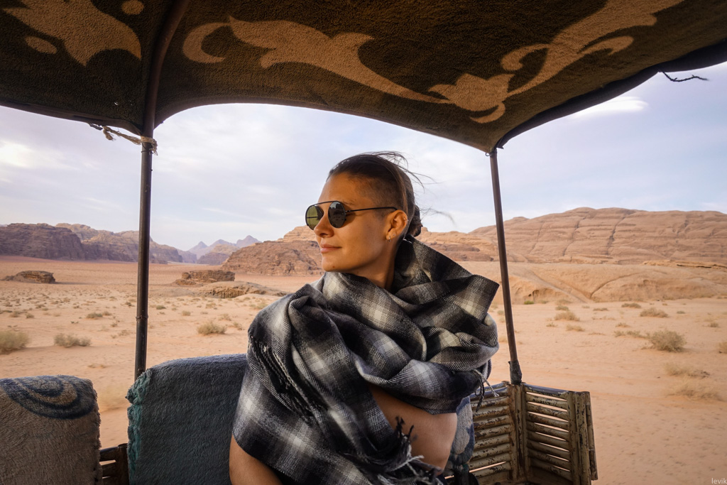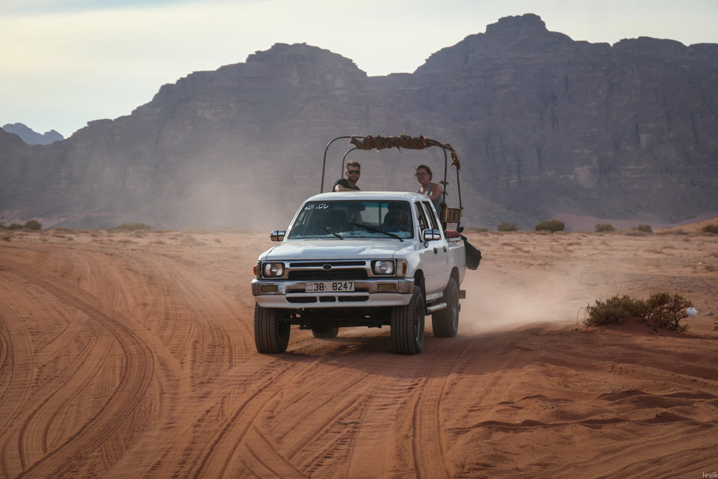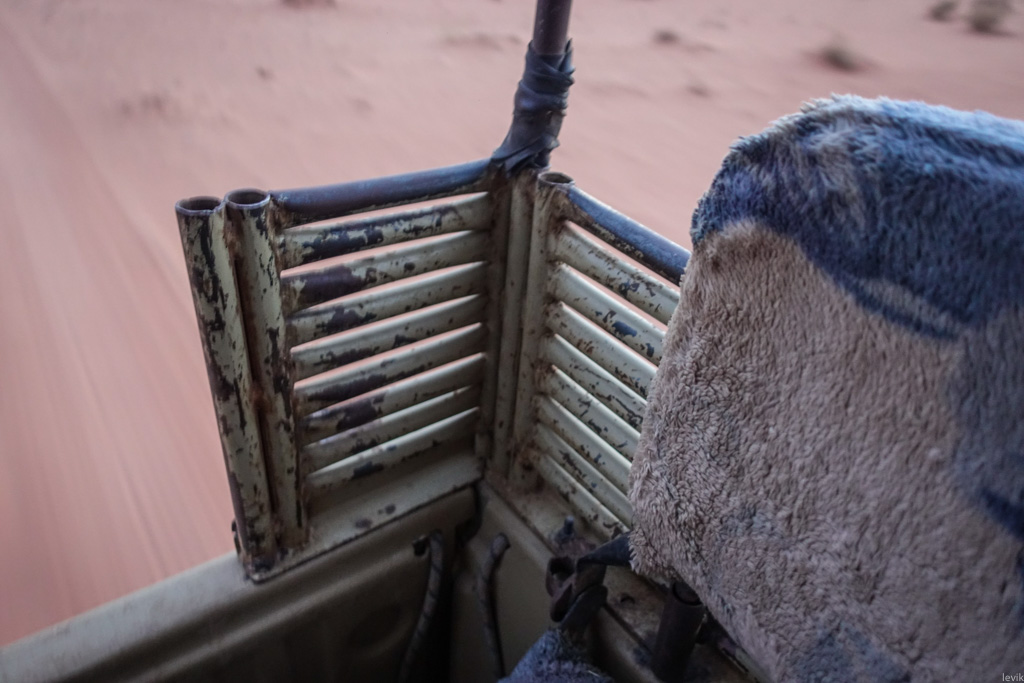 4. Кузов был сварен из металлических труб, навес создавал тень от знойного иорданского солнца. В нём находилось две обитых непонятной плюшевой тканью скамьи. В общем ехать было удобно, даже когда джип скакал по песчаным дюнам.