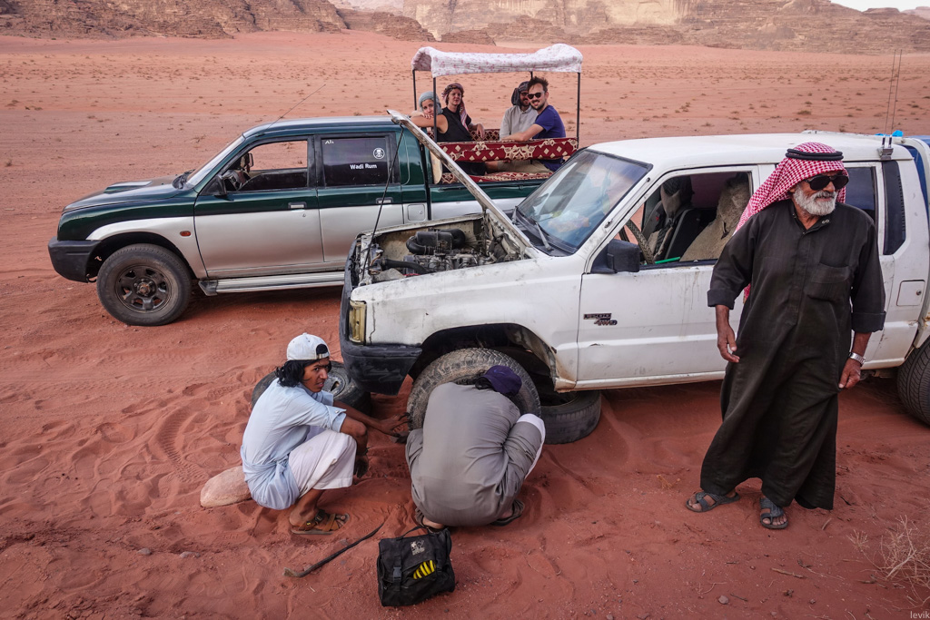 34. А вот кто-то долихачился. У машины произошла какая-то поломка. В таких случаях местные бедуины помогают друг-другу с починкой, даже если это значит, что их туристы вынуждены ждать, пока работа закончится.