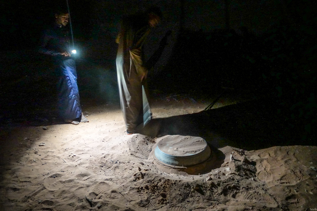 47. Через какое-то время к костру пришла ещё одна пара, туристы из Германии. Оказалось что этим вечером мы вчетвером - единственные гости этих конкретных бедуинов. Так как все гости были в сборе, нас пригласили ужинать. Оказалось, что ужин в прямом смысле закопан под землёй. Ребята взяли лопату и при свете мобильных телефонов начали разгребать груду песка.