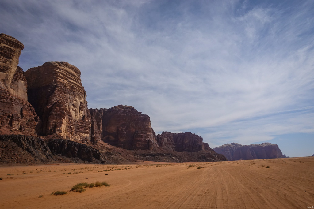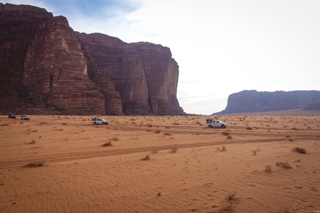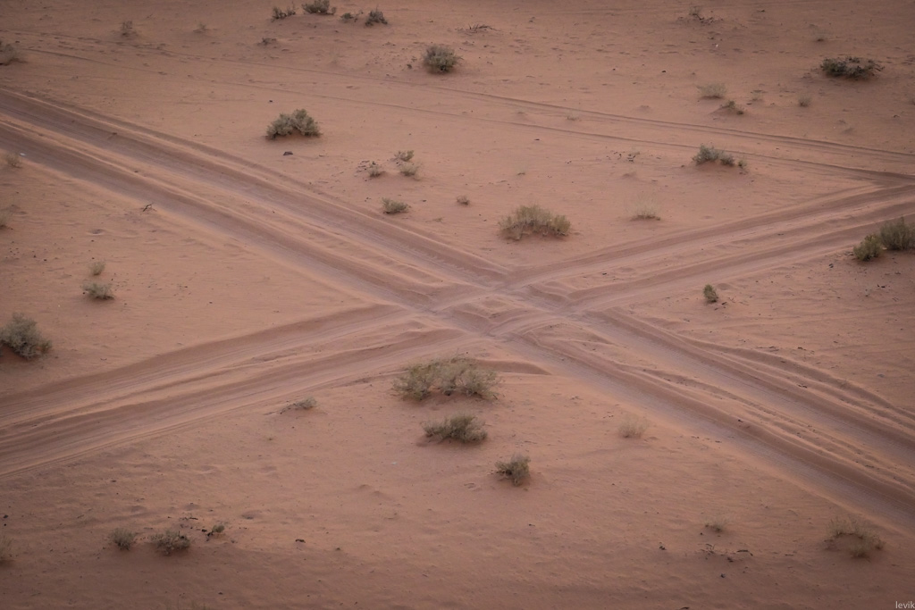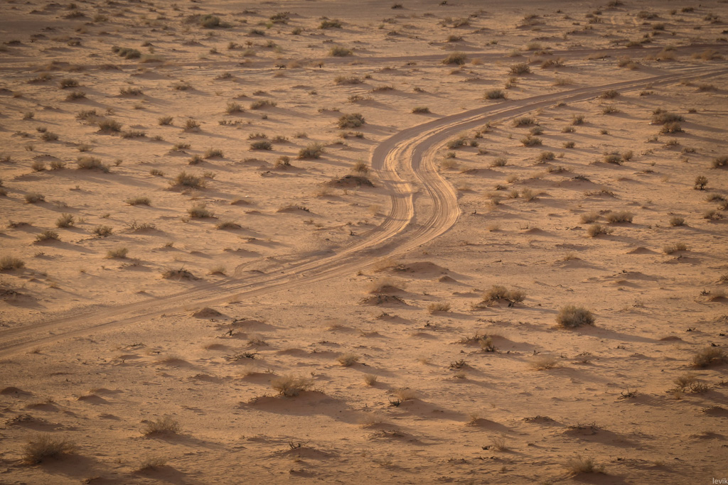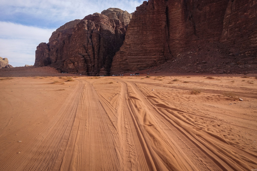 14. Только следы колёс на песках напоминали, что мы здесь не одни. Таких проторенных дорожек в Вади Рам немало. Всё же это место довольно популярно среди туристов. К счастью, пустыня большая, и чаще всего других машин не видно.