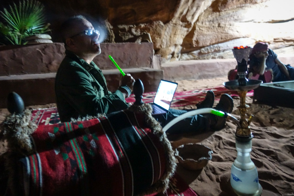50. После ужина я вернулся к костру, прихватив компьютер. Именно здесь я написал пост про наш с Тоней день в Москве (трудно поверить, но это было буквально накануне!) Бедуины раскурили кальян, и угостили им нас.