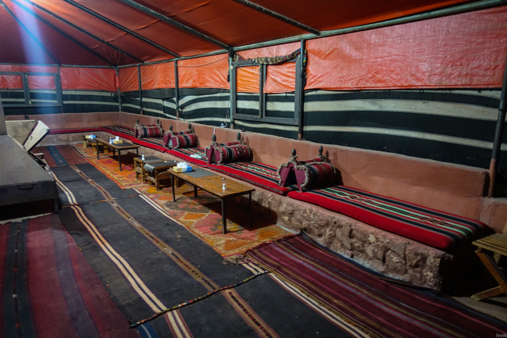 43. После заката мы поехали в пустынный лагерь бедуинов. Такие лагеря разбросаны по всему Вади Рам - обычно они ютятся у подножия здешних скал. Каждый оператор бедуинских туров имеет свой лагерь, и, насколько я понял, они все примерно одинаковые. Это несколько двухспальных "шатров" (на самом деле, хлипких хижин, обтянутых материалом из верблюжьей шерсти).