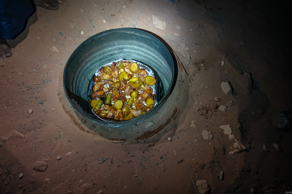 Бедуины расчистили песок, под которым оказалась металлическая крышка, прикрывающее бочку с приготовленной едой. Раньше её засыпали углями, а гриль с курицей и овощами поставили сверху на несколько часов. Теперь всё было готово, можно было доставать и есть.