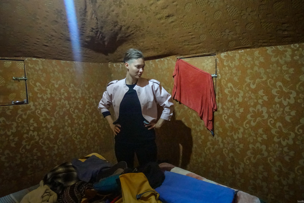 45. Вот как выглядит такой шатёр изнутри. Это маленькая комнатка с двуспальной кроватью. Две крохотных форточки тоже обиты материей, так что когда они закрыты, в помещение не проникает дневной свет. На потолке висела противно-белая люминесцентная лампа, и даже была одна розетка, через которую мы зарядили телефоны.