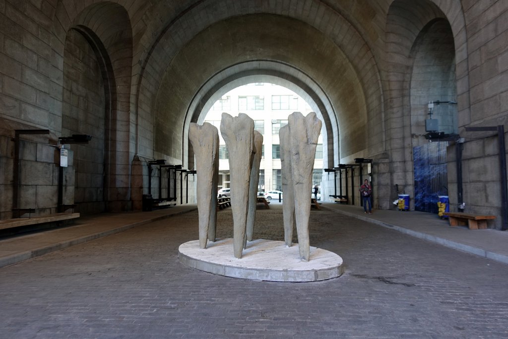 Вот, например, такая скульптура, стояла тут какое-то время назад. Справа на этой фотографии можно заметить синий забор. Это проход, который я никогда не видел открытым, скорее всего на какое-то технический пространство, куда простых смертных не пускают.