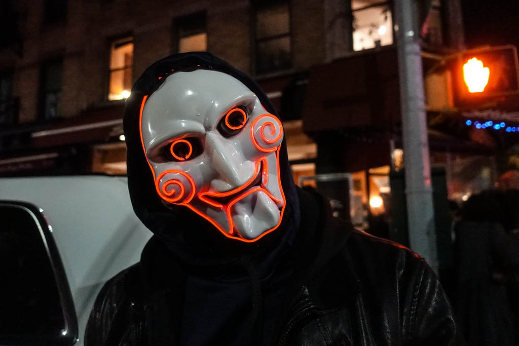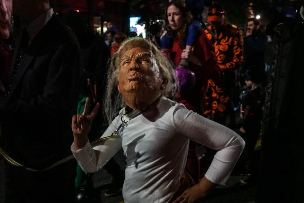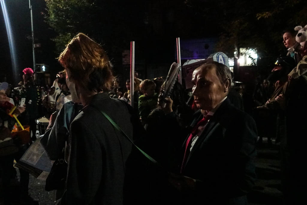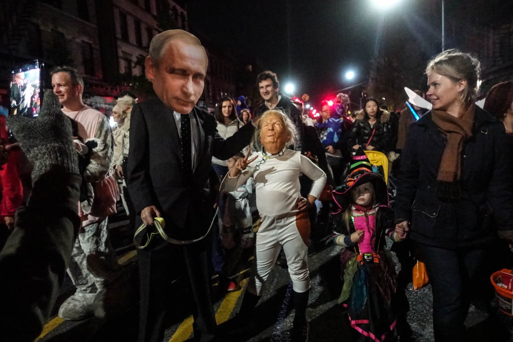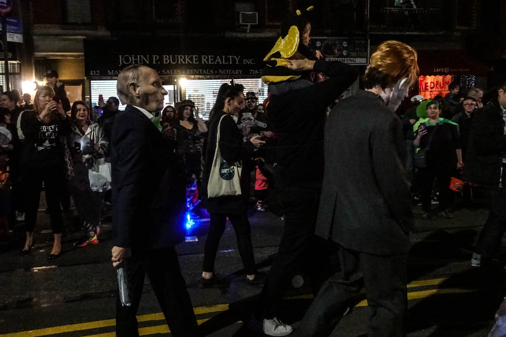 Понимаете, каждый год, тридцать первого октября... Вернее, нет, не так. Сегодня Нью Йорк праздновал прекрасный православный праздник Хэллоуин. По поводу этого прекрасного весёлого дня весь город имеет обыкновение наряжаться в разные костюмы и идти гулять по ещё довольно тёплым улицам. В разных районах устраиваются праздничные парады, и вот на одном из таких я сегодня встретил Владимира Владимировича™, который вёл на поводке...