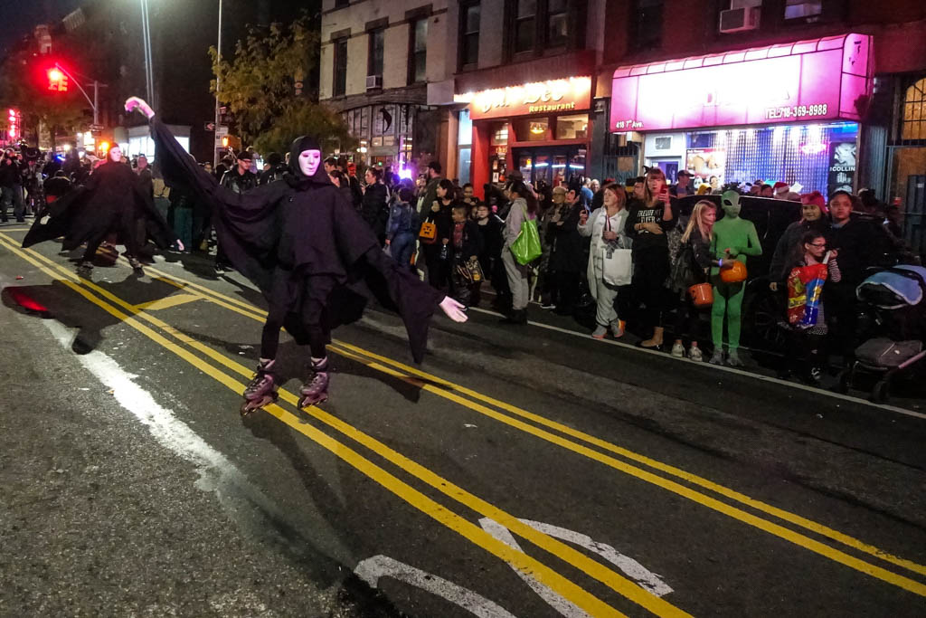 5. Долгое время народ просто мялся на улице, но потом зазвучали барабаны и шествие парада тронулось. Обычно организаторы таких мероприятий стараются поставить в голову колонны самых интересных, изобретательных, и запоминающихся персонажей. (Как тут не вспомнить "летающих" амуров амстердамского гей-парада?) В данном случае парад возглавляла труппа людей на роликах, в чёрных балахонах с белыми масками и длинными руками на палках.