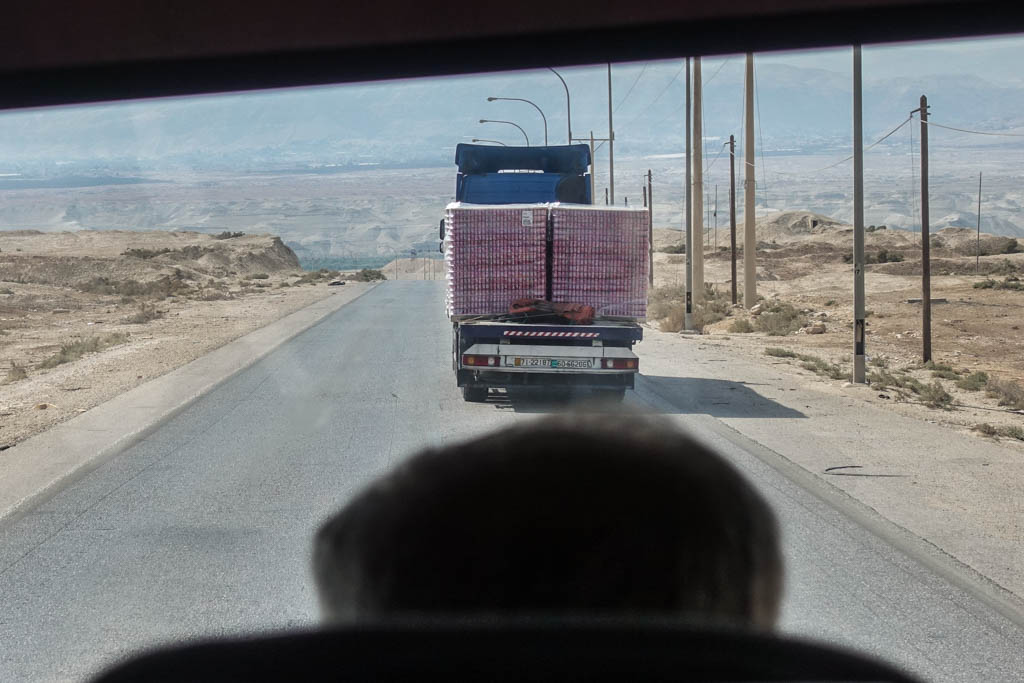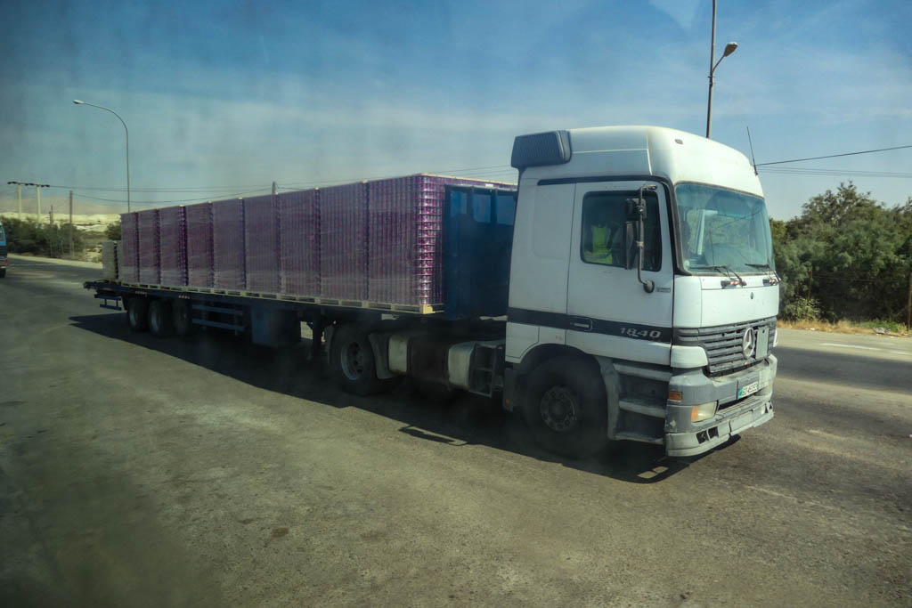 27. Оказалось, что это целые стеллажи Фанты в баночках! Кроме этого мы видели таки же грузовики со Спрайтом. Возможно это везут на Западный Берег, может гуманитарка, а может просто на продажу?