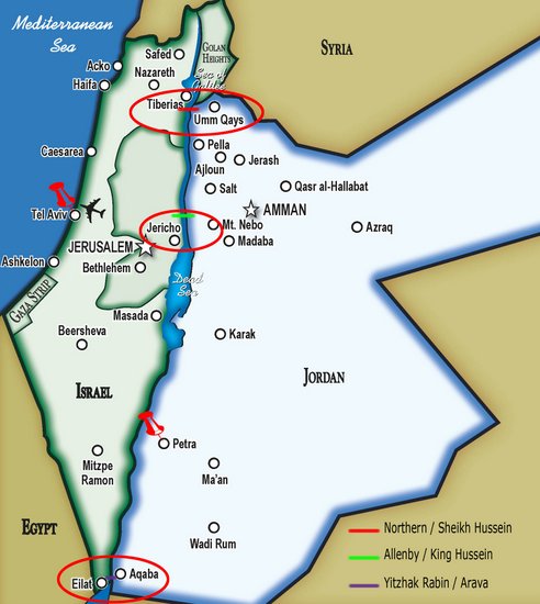 Давайте посмотрим на карту двух государств. Красным цветом я обвёл три места, где между ними действуют пограничные переходы. На севере возле города Тверия, на юге между Эйлатом и Акабой, и возле Мёртвого Моря, через мост Алленби.