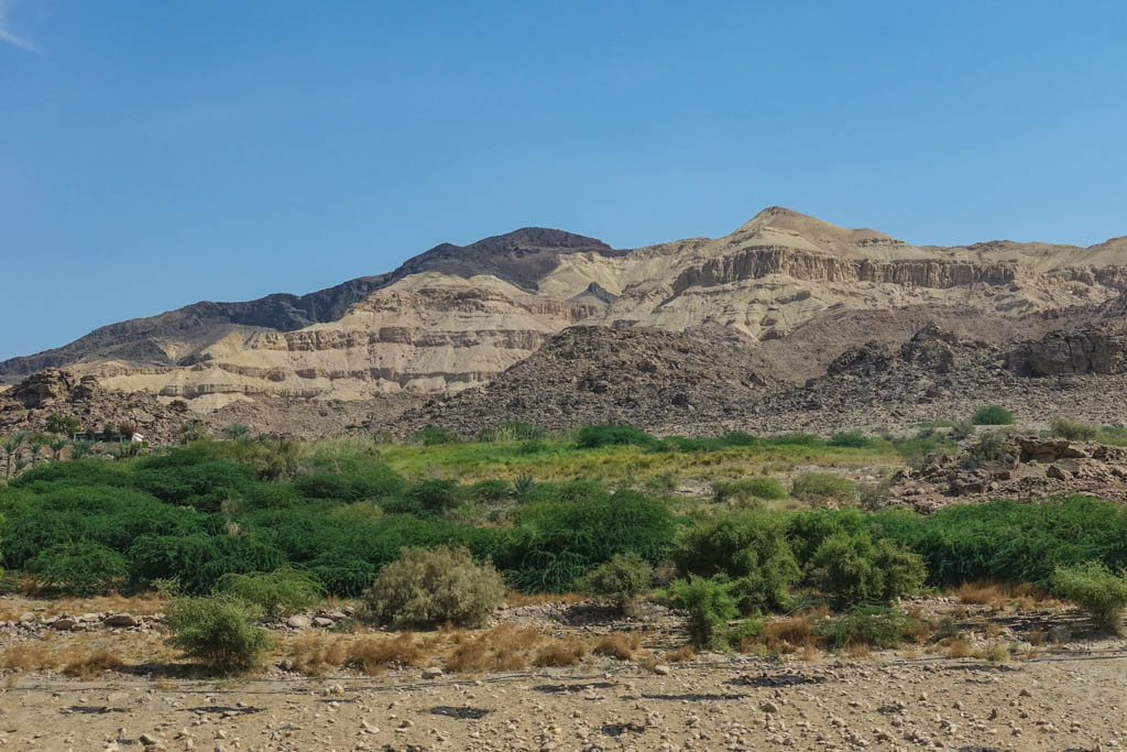 1. Едем на север по западной Иордании. Вокруг всё песчано-охровое, лишь немного зелени растёт вдоль дороги, да и то - мелкие пустынные кустики.