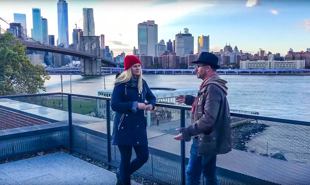 Как вы знаете, я сам ещё не дорос до собственного Ютуб-канала, но иногда принимаю участие в роликах других видео-блогеров. Согласился и на этот раз. Мы встретились с Викой в Дамбо, возле великолепных нью-йоркских мостов, и побеседовали около часа: