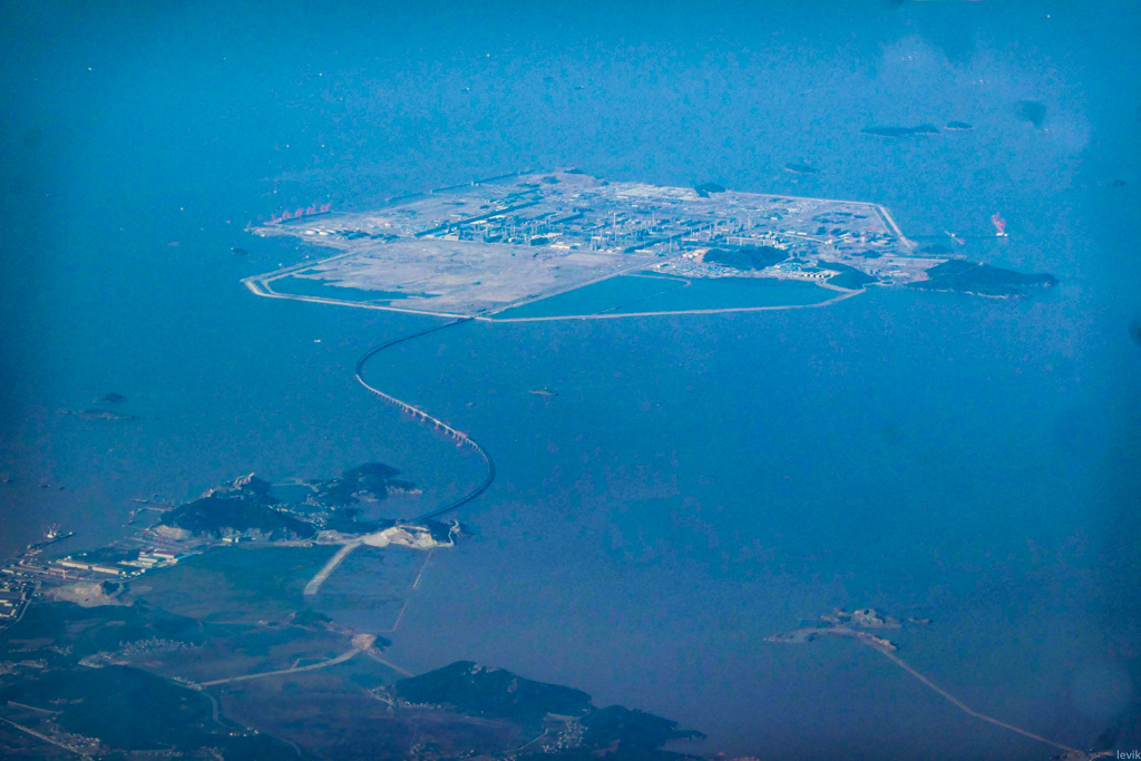 19. Прямо перед посадкой за окном появился ещё один остров, который построили совсем недавно. Только в отличии от других, здесь не расширили уже существующий остров, а взяли и создали абсолютно новый, с нуля. Узнаёте его? Он служит въездом в туннель, который является частью морской дороги между Гонконгом и Макао.