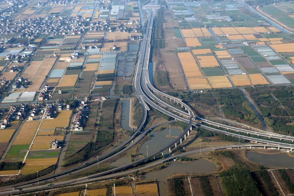 3. Прямо за аэропортом начинаются сельскохозяйственные земли, их рассекают извивающиеся ленты автомагистралей.