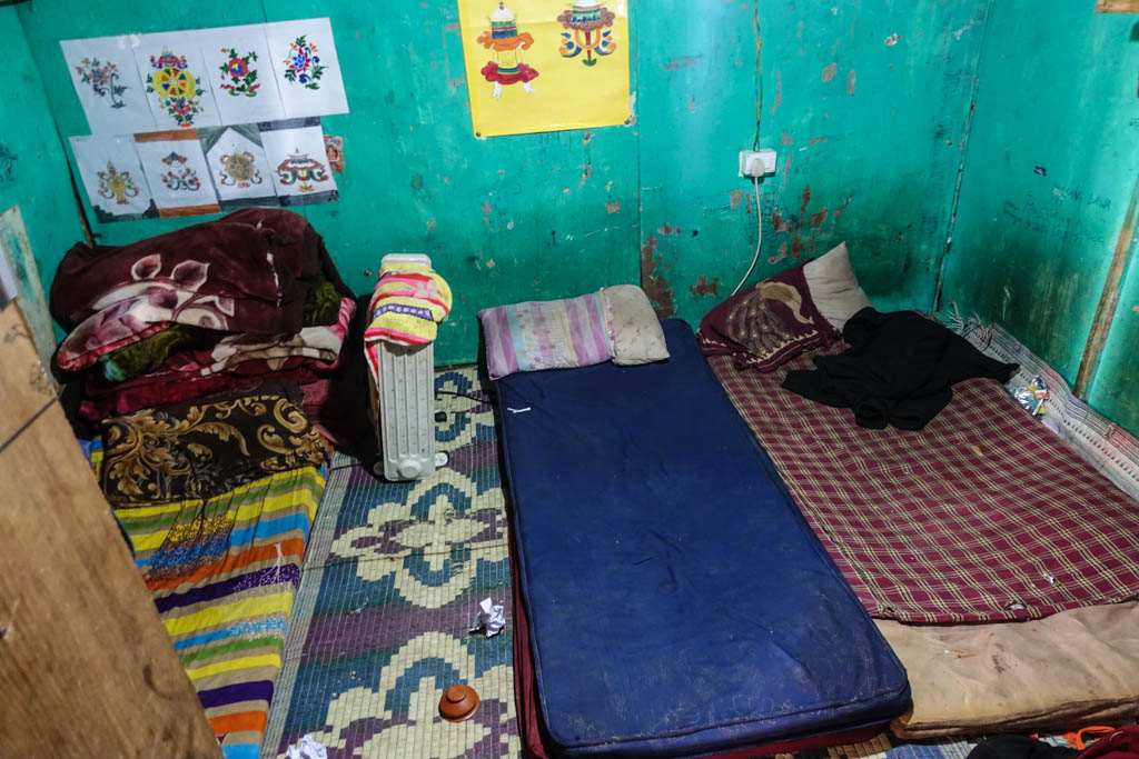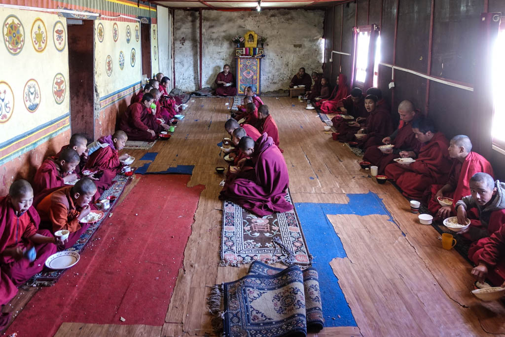 Меню разумеется вегетарианское, в основном это варёный рис, и какие-то овощи. Мы ели в соседней комнате, в похожих условиях. Правда, нам дали с едой мясо и вилки. Но я уже писал о том, как в Бутане обстоят дела с мясом.