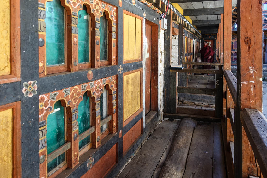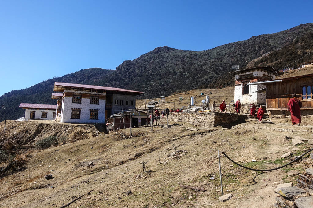 5. Но вернёмся к монастырю. На сравнительно плоской местности здесь построено несколько зданий в традиционном бутанском стиле. Здесь живут, учатся, молятся монахи. Они суетятся между этих домиков в своих красных халатах, выполняя какие-то повседневные дела.