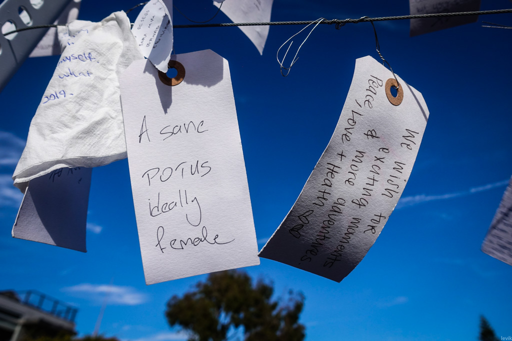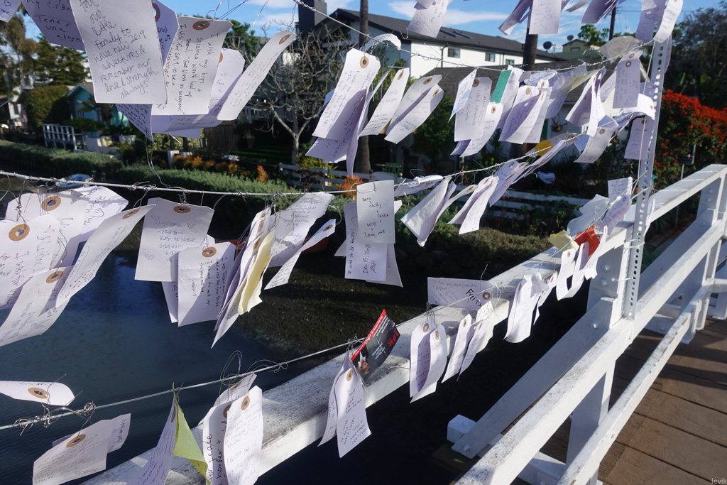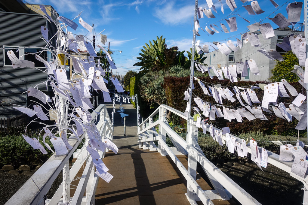 7. Стороны этого моста были завешены белыми ярлычками, которые с шелестом развевались на лёгком калифорнийском ветерке.