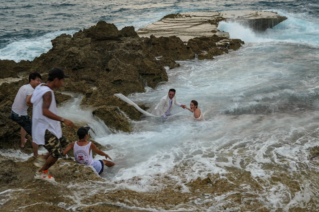 14. Они стойко позировали до того момента, пока мощь воды не сбила их с ног. Глядя со стороны, эта волна вроде как и не была сильно больше предыдущей, но как-то неожиданно, бурлящие потоки пены накрыли весь уступ камня, на котором находились жених с невестой.