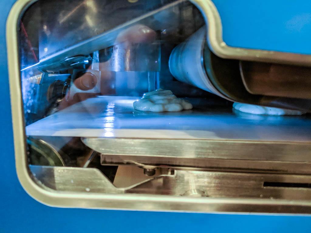 Устроено всё по принципу конвейерных тостеров. Машина выдавливает на тесто на медленно-движущуюся ленту, которая проходит между горячих элементов.