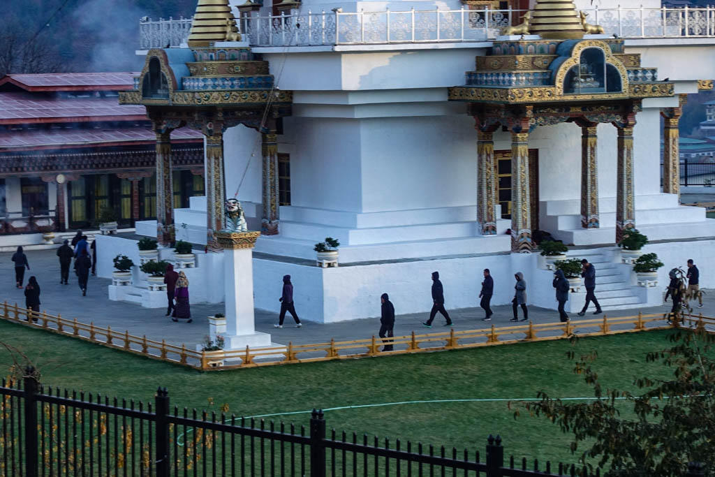 22. Тхимпху-чортен считается главным религиозным объектом страны, и сюда идёт постоянный поток паломников. Они считают за честь обойти вокруг этой ступы в направлении часовой стрелки. Вот так весь день и ходят люди. Мы жили в гостинице прямо напротив этой ступы, и я фотографировал их из окна. Это рано утром, сразу на рассвете.