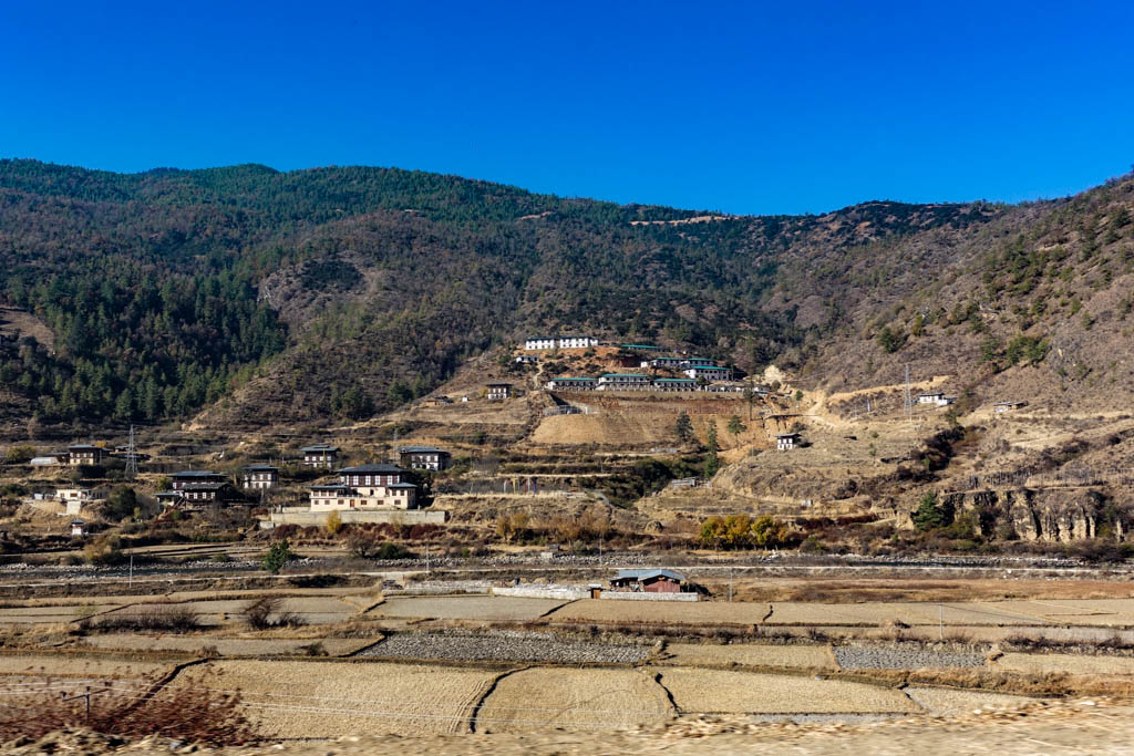 17. До недавнего времени в Бутане не было городов, дзонги были центрами местной жизни. И до сих пор, городов в нашем с вами понимании практически нет. По большей части, местность выглядит вот так - пашни и редкие домики:
