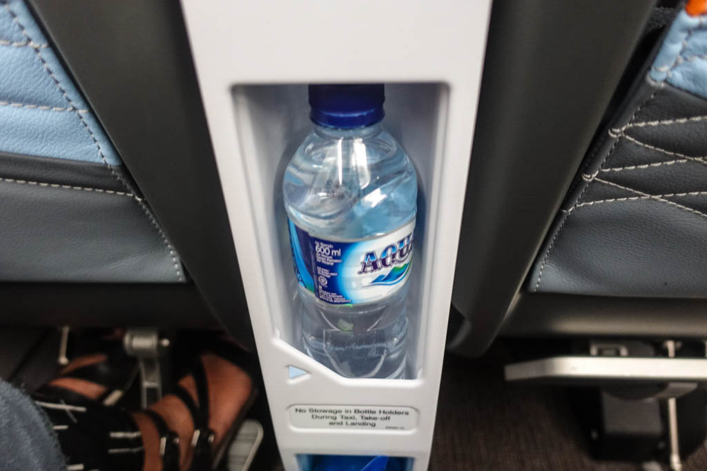 21. Между спинками сидений две ячейки для бутылок с водой. Так как они расположены одна над другой, в нижнем углу возле каждой есть маленькая стрелочка, которая показывает, какому из пассажиров она принадлежит.