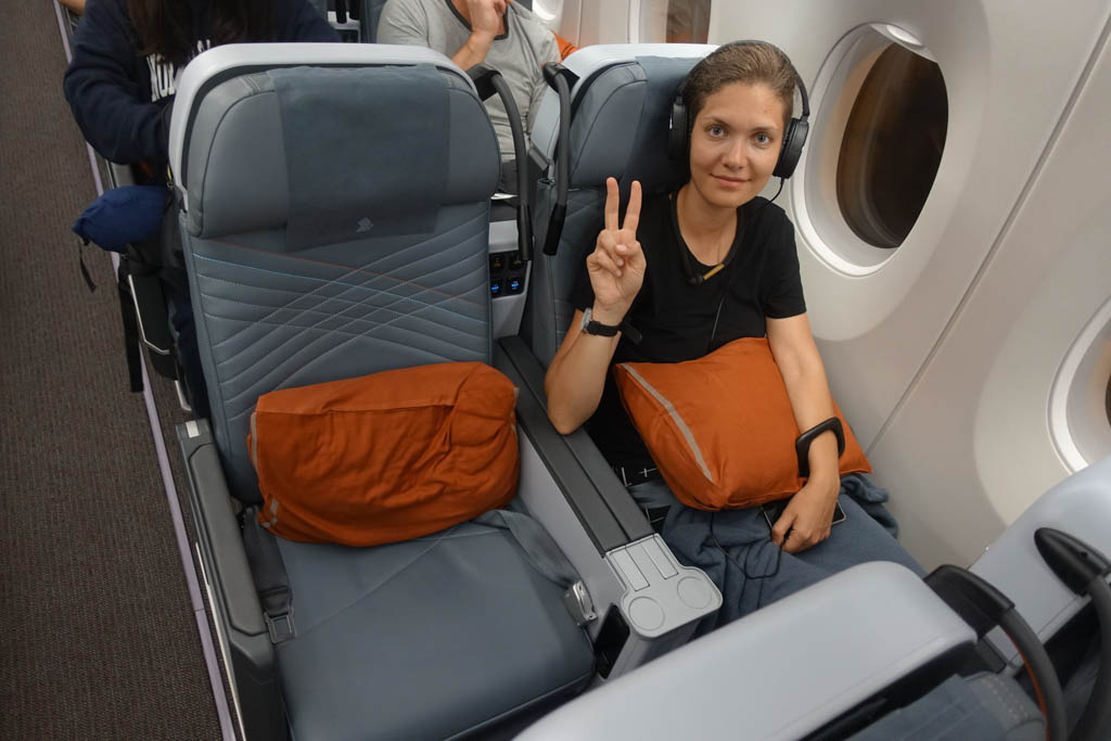 10. Но, так уж вышло, что нам с Тоней пришлось лететь в премиальном экономе. Это такая промежуточная ступень между обыкновенным эконом классом, и бизнесом. Аэрофлот называет такой класс "Комфорт". Если честно, я его не очень люблю, потому что подлокотники между креслами нельзя поднять, так что даже если у тебя весь ряд свободный, этим никак нельзя воспользоваться чтобы вытянуться.
