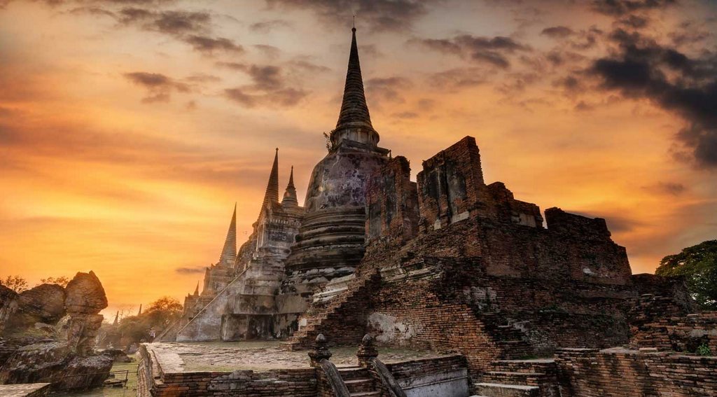 1. Вот типичная красивая картинка Аютайи их интернетов. Тут мы видим развалины, острые шпили храмов-ступ, и огненное оранжевое небо. Очень многие красивые фотографии отсюда сняты на закате. Мне кажется, я понял, почему это так - расскажу свою версию чуть позже в этом посте.