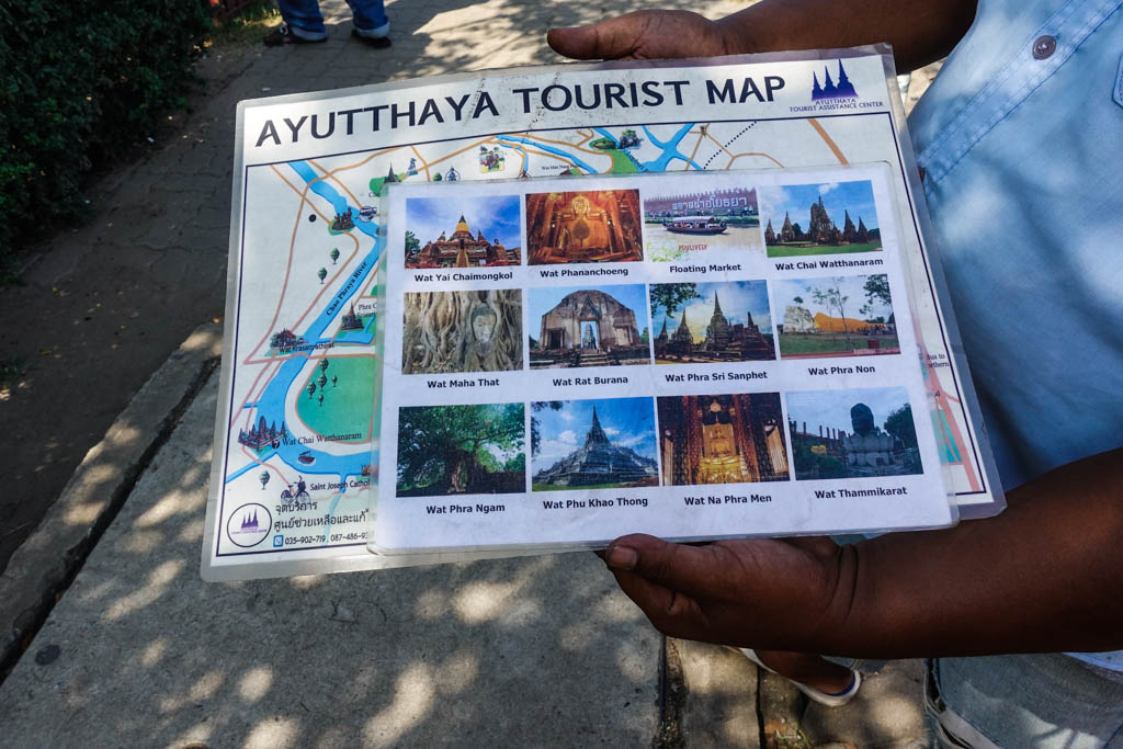 7. У каждого есть карта главных достопримечательностей Аютайи, с красивыми картинками. Они показывают вам все эти места, и объясняют: "Вот от этого храма до этого Будды - десять километров. Пешком - никак. Давай я тебя по всем местам прокачу, всё покажу, на тук-туке очень быстро будет."