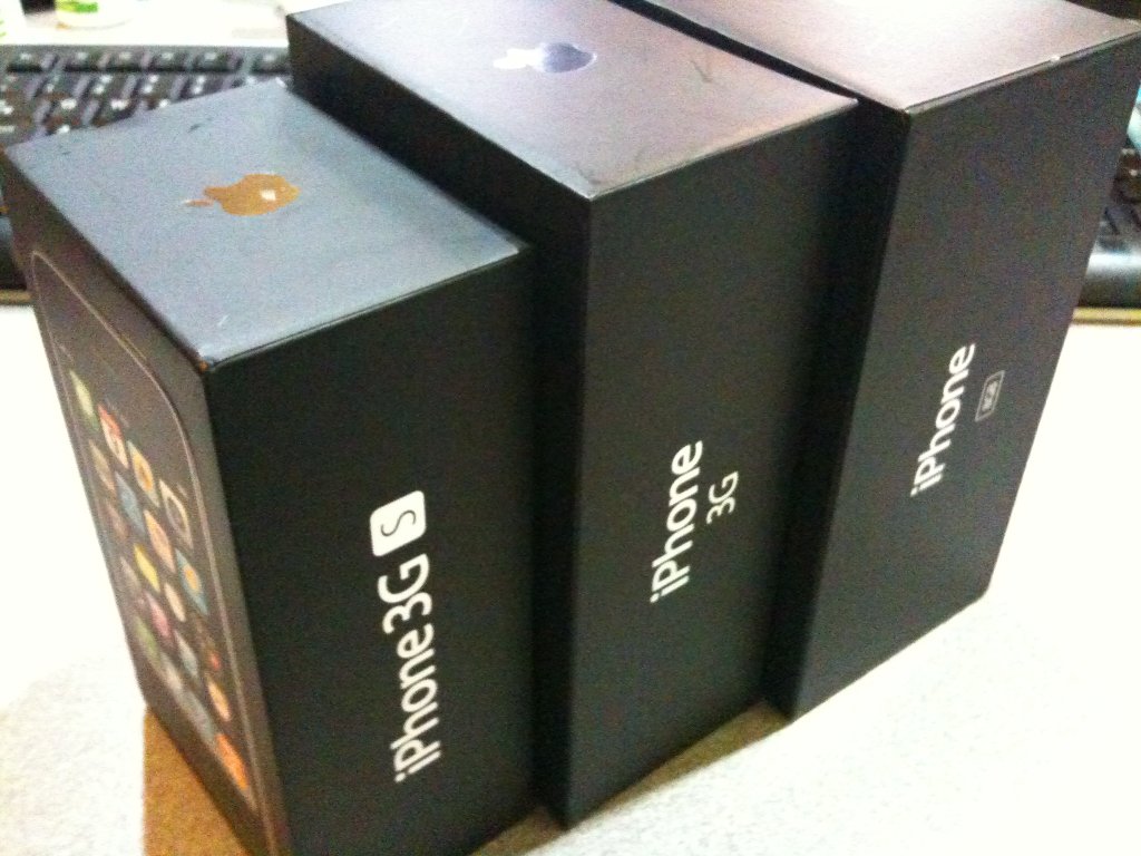 Первые Айфоны появились в 2007 году, и их упаковка была значительно крупней. Но потом в 2008 и 2009 вышли 3G и 3Gs, которые становились всё меньше. Вот это не мои коробки, просто фото из сети: