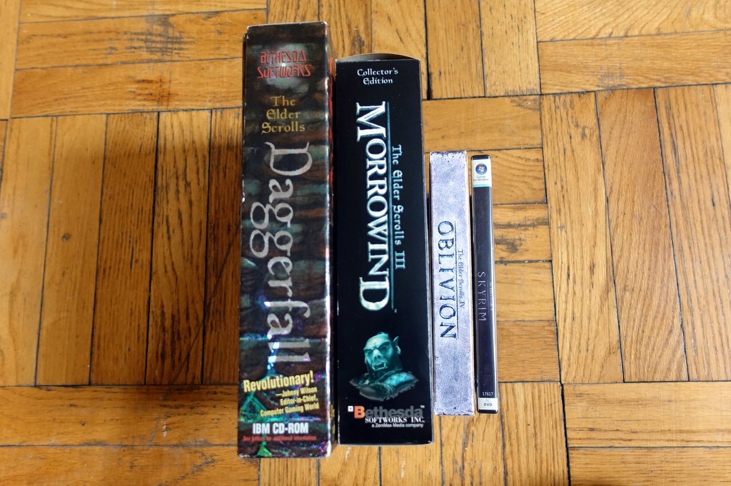 Вот ещё один пример: упаковки игр из серии Elder Scrolls. Первой у меня нет, зато есть вторая - Daggerfall (1996), третья - Morrowind (2002), четвёртая - Oblivion (2006), и пятая - бесподобный Skyrim (2011). Очень заметный шринкидж: