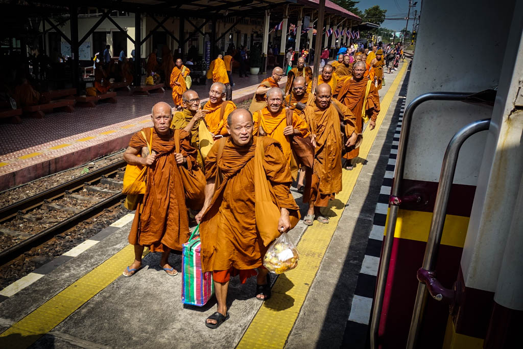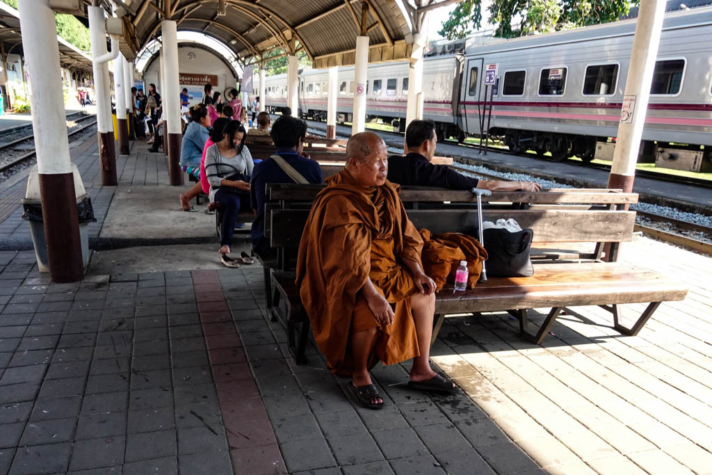 45. Вот, наконец приехали! Так как Аютайя - исторический центр с кучей храмов, направление популярно среди монахов. Целые толпы ждут на платформе.