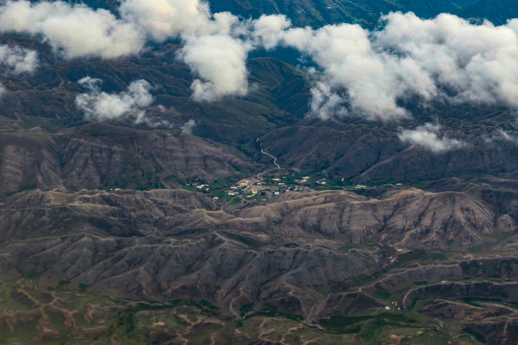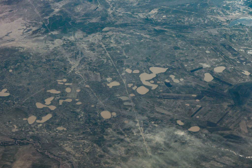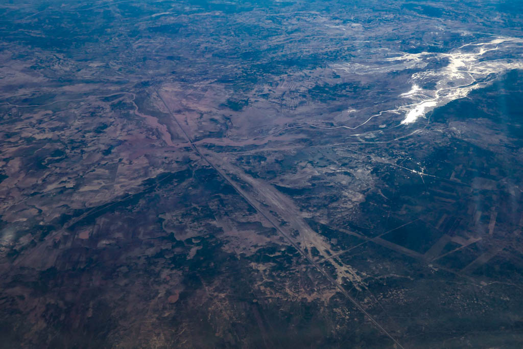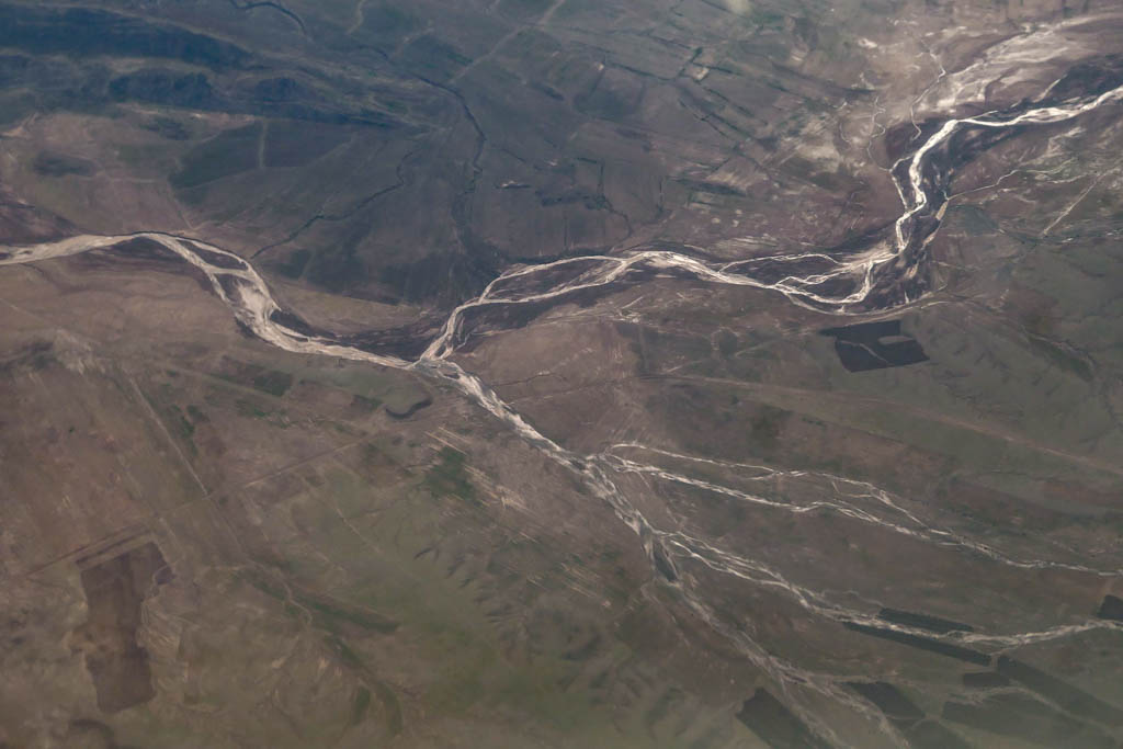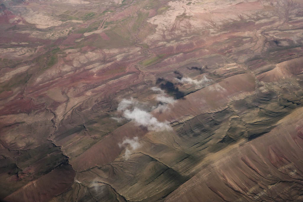 18. И тут ландшафт начал резко меняться: под нами появились бурые разводы какой-то неясной породы. Не знаю, как это выглядит с земли, но сверху очень красиво.