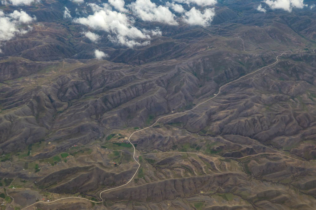5. Вскоре мы оставили город позади, и летим над резным рельефом гор, покрытых зеленью. Внизу под нами извивается дорога. Иногда видны отдельные домики.