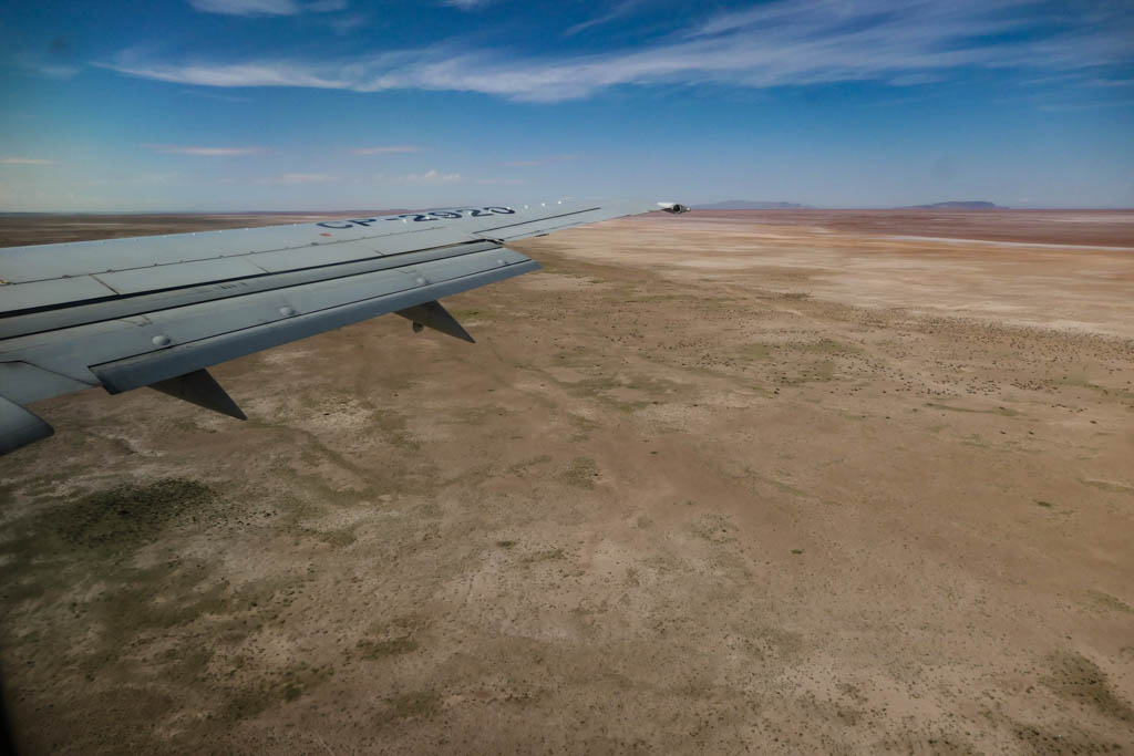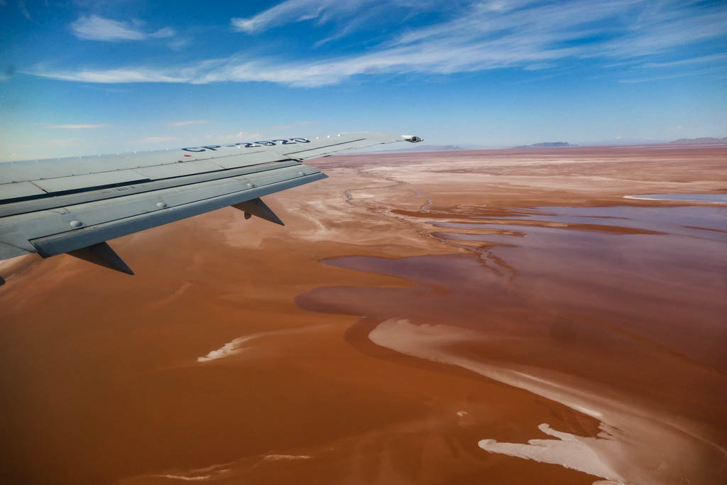Знаменитый солончак Уюни находится более чем в 500 километрах от главного города Боливии, Ла-Паса (который, при этом не столица!) Говорят, часть этого пути можно проделать на каком-то древнем и очень медленном поезде, но так как не все в нашей группе разделяли мой железнодорожный энтузиазм, мы полетели самолётом. Эти пару часов тоже оказались довольно зрелищными - весь полёт под крылом протекала постоянная вереница различных непонятных и цветастых ландшафтов.