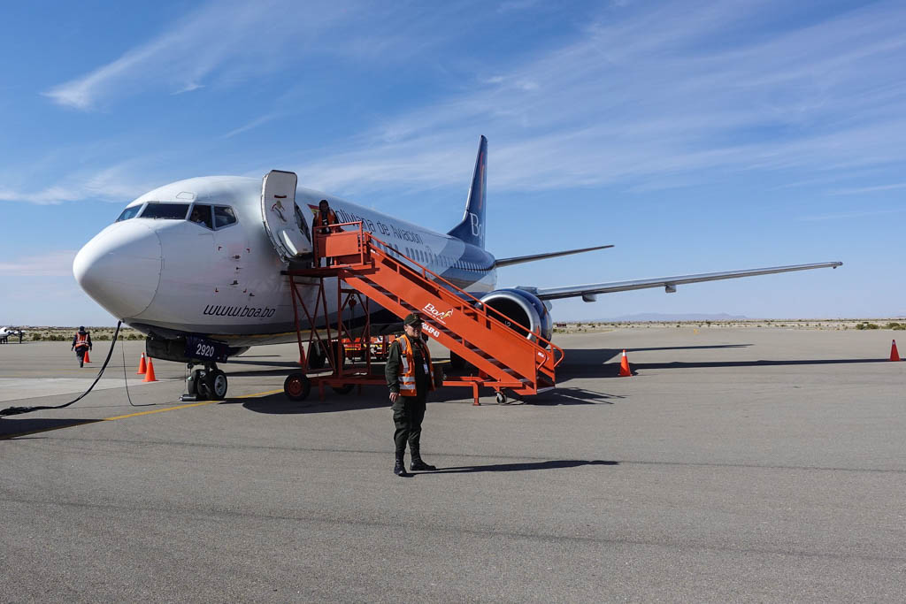23. В крохотном аэропорту Уюни нет телетрапов. Пассажиров выпускают по обычному трапу на колёсиках. Здесь высота над уровнем моря 3,660м, и прохладный утренний воздух очень приятно освежает. (Это временное, обманчивое ощущение, через пару часов наступит 35-градусная жара.)