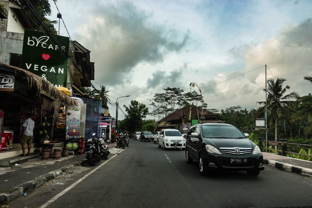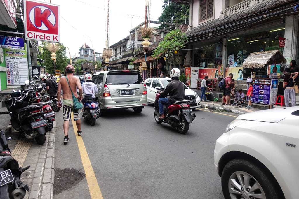 1. Вот как выглядит средняя дорога (она же улица) на Бали. Это одна узкая полоса в каждую сторону с крохотной обочиной, и узкими тротуарами. Если уехать куда-нибудь на север, где и в разгар туристического сезона народу не так много, то таких дорог вполне хватает. Но на юге острова, где расположены самые популярные пляжи, или в Убуде, где тусуются туристы-хипстеры, автолюбителей побольше. Здесь по таким дорогам катит нескончаемая вереница машин.