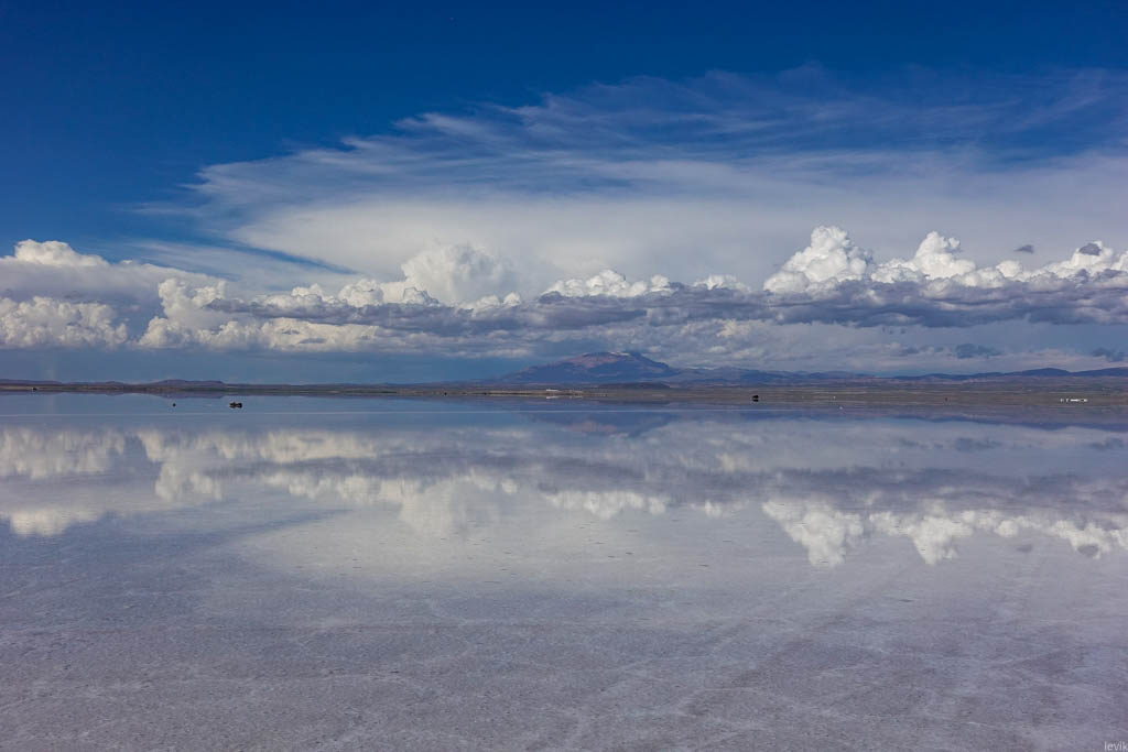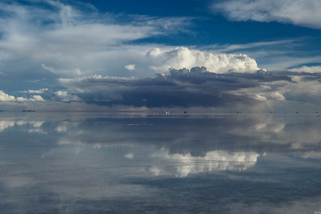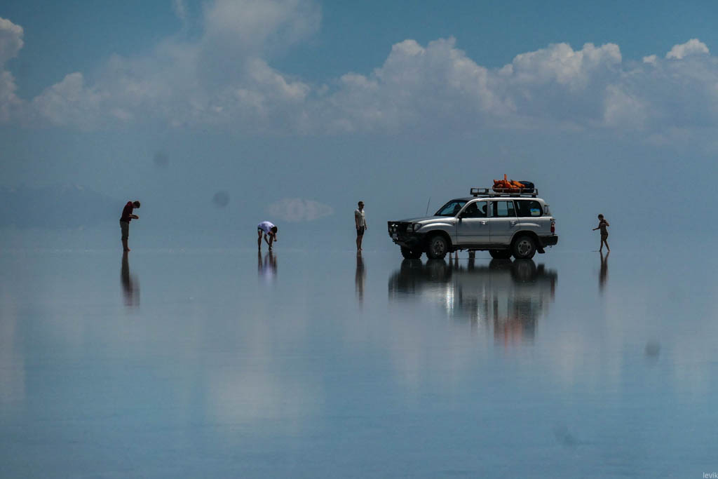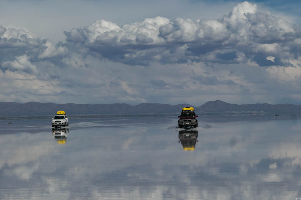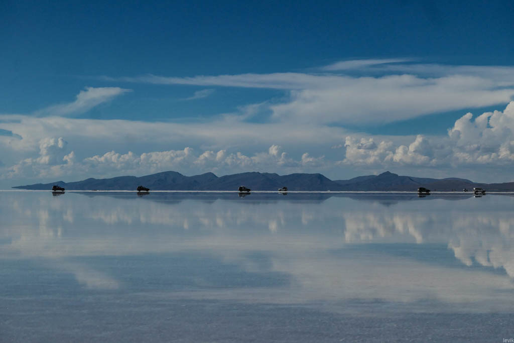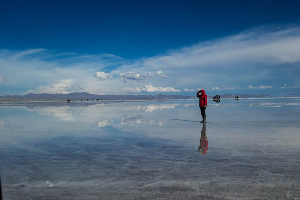 7. Не знаю, насколько редкий это феномен, но на случай, что погода окажется не на нашей стороне в первый день, у нас программе на Уюни было заложено два дня. Однако, нам сразу повезло, и приехав на солончак после посещения ржавых паровозов, мы увидели прекрасную спокойную поверхность, в которой отражались облака и горы. Вдали на горизонте, пространство бороздили чёрные точки местных внедорожников.