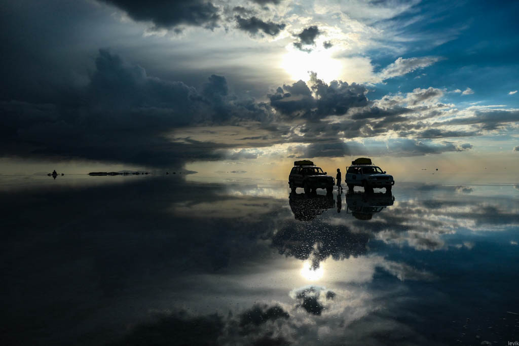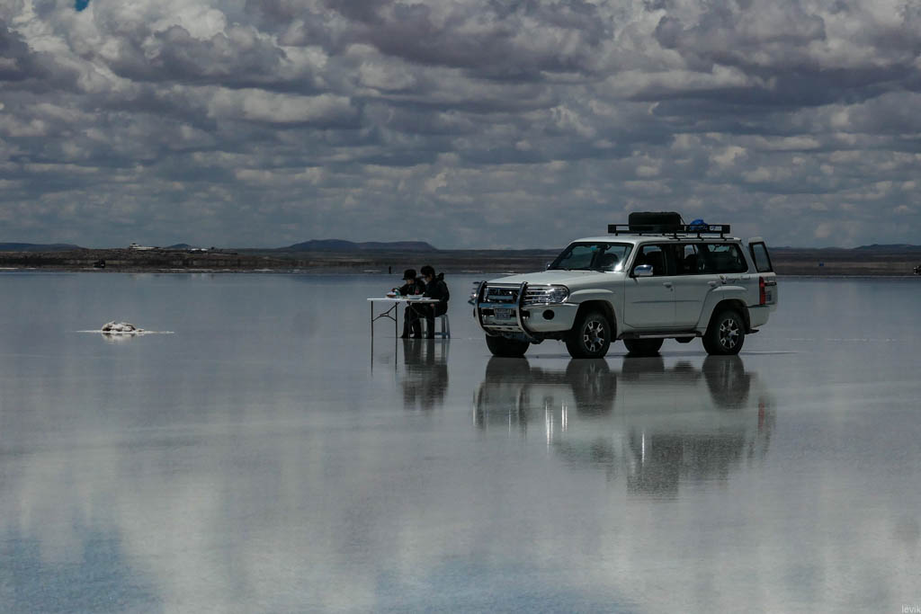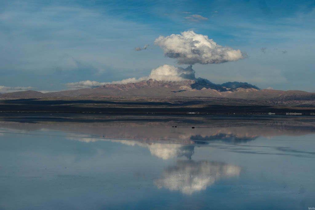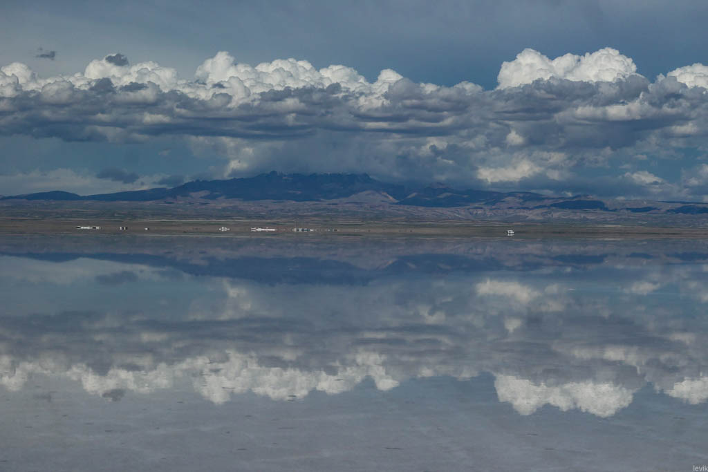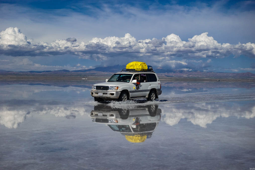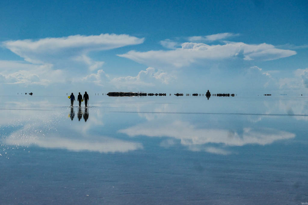7. Не знаю, насколько редкий это феномен, но на случай, что погода окажется не на нашей стороне в первый день, у нас программе на Уюни было заложено два дня. Однако, нам сразу повезло, и приехав на солончак после посещения ржавых паровозов, мы увидели прекрасную спокойную поверхность, в которой отражались облака и горы. Вдали на горизонте, пространство бороздили чёрные точки местных внедорожников.