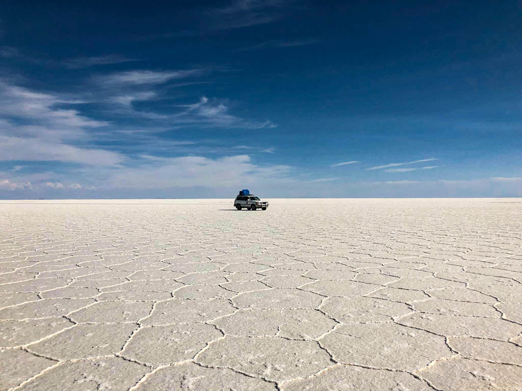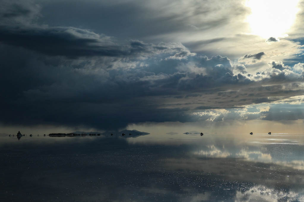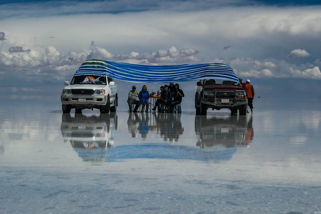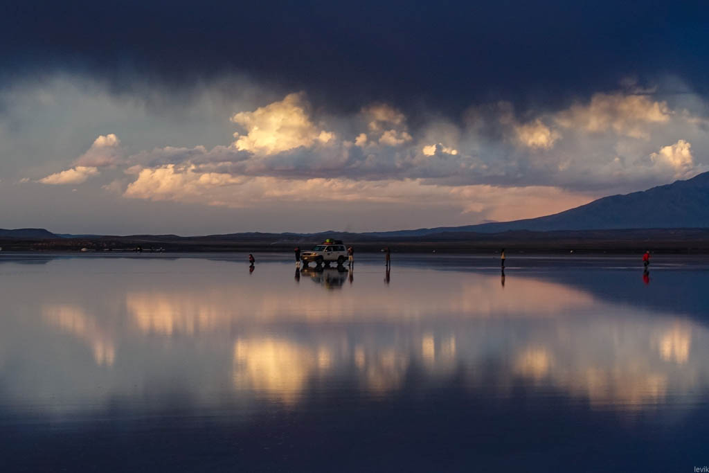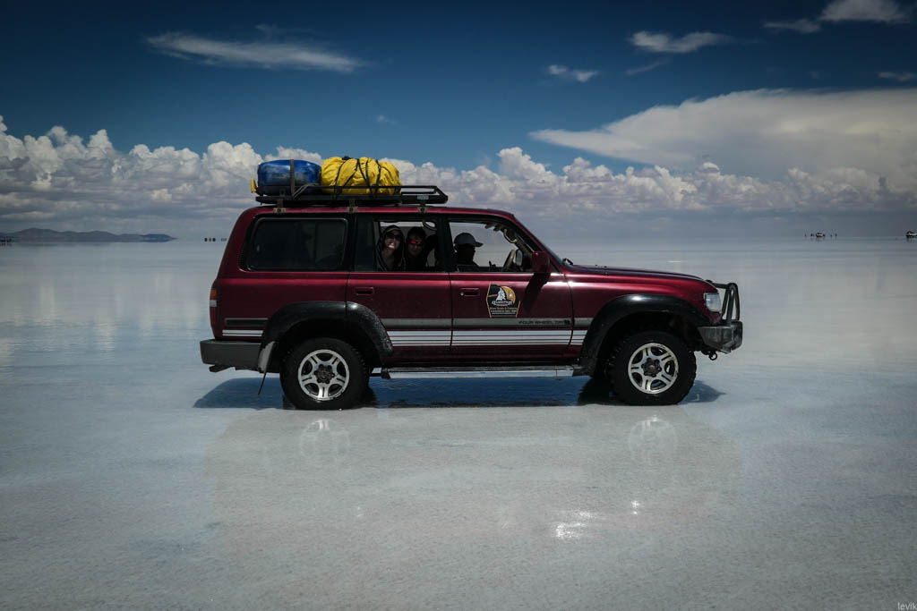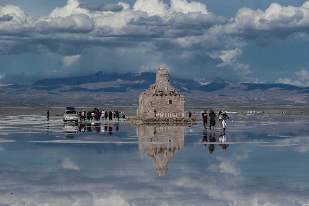7. Не знаю, насколько редкий это феномен, но на случай, что погода окажется не на нашей стороне в первый день, у нас программе на Уюни было заложено два дня. Однако, нам сразу повезло, и приехав на солончак после посещения ржавых паровозов, мы увидели прекрасную спокойную поверхность, в которой отражались облака и горы. Вдали на горизонте, пространство бороздили чёрные точки местных внедорожников.