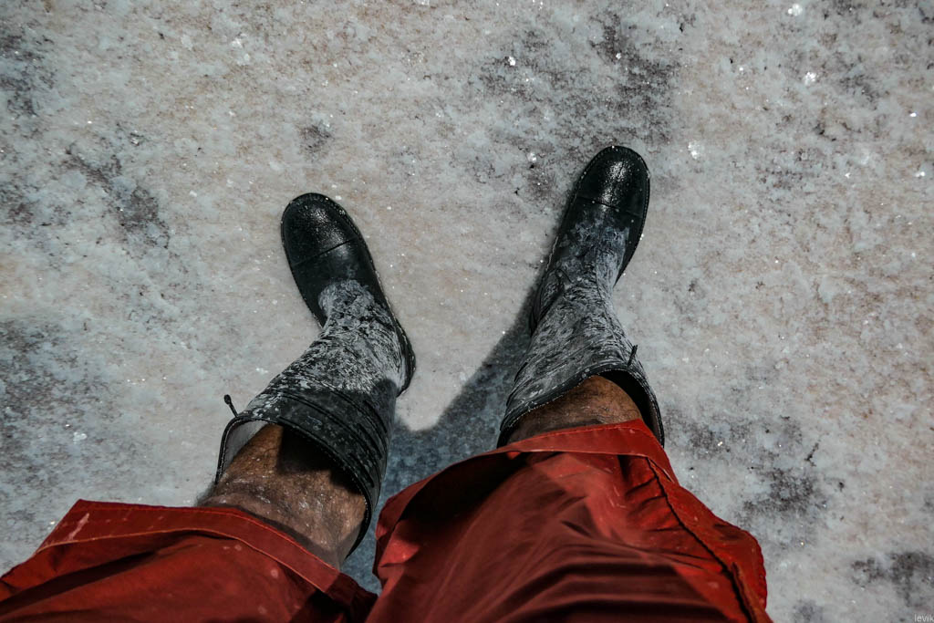 15. Однако, поверхность солончака не очень приятна для босых ног: солевые кристаллы оказались довольно острыми, и кололи мне подошвы. Короче, этот эксперимент я закончил очень быстро.