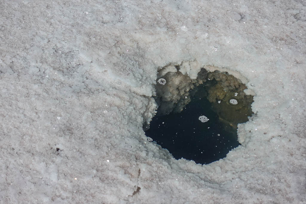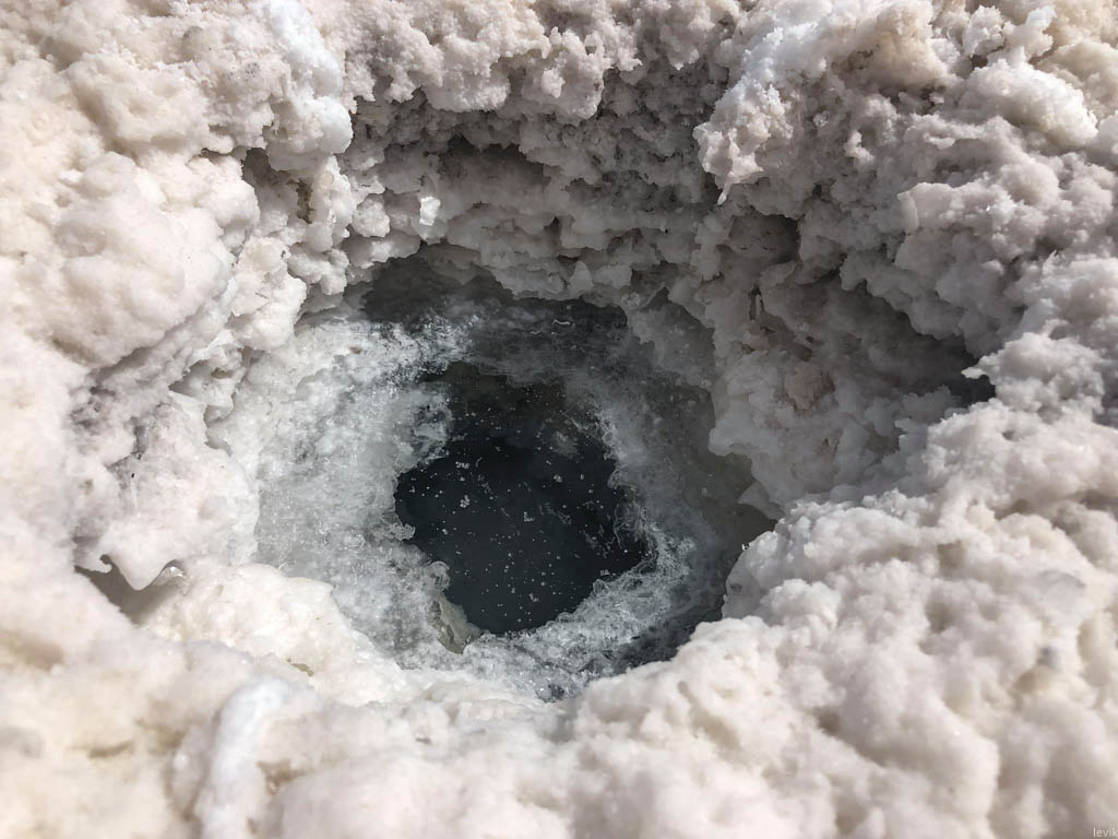4. Вода присутствует в солончаке круглый год, просто в сухой сезон её уровень низок, и она скрывается под поверхностью солевого слоя. Иногда здесь можно встретить ямку, в глубине которой видно уровень воды даже в сухие месяцы.