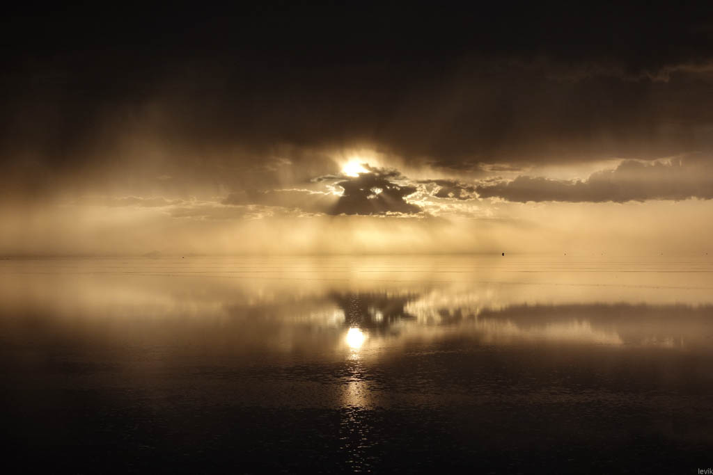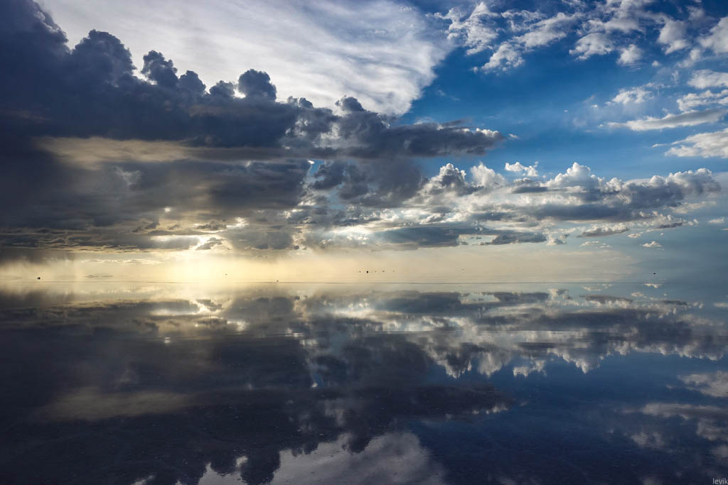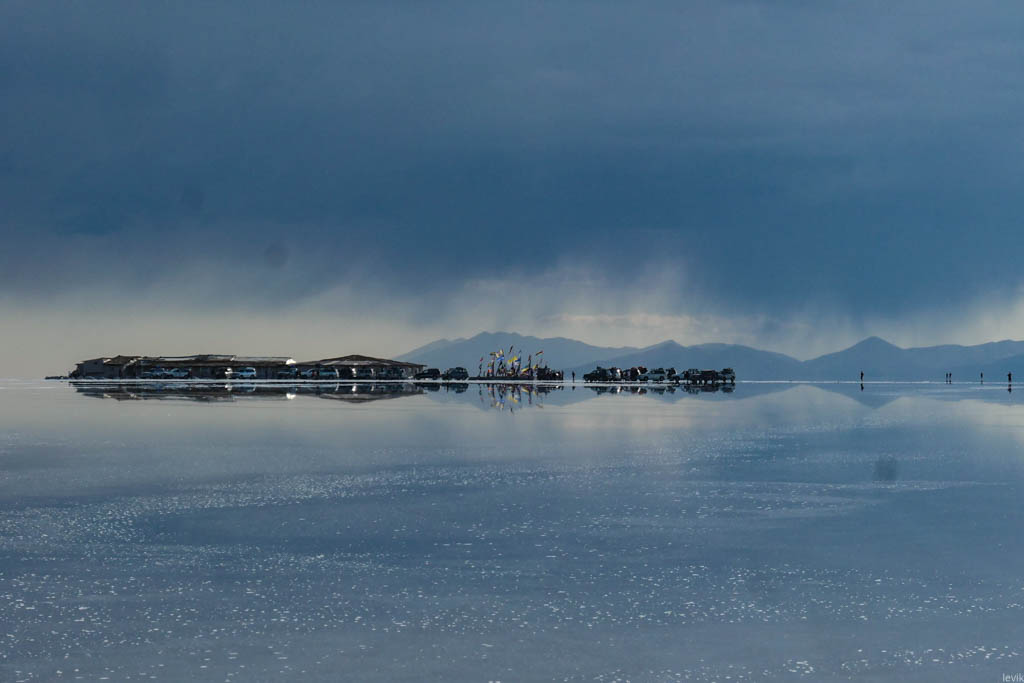 А ведь мало того чтоб уровень воды поднялся. Надо ещё застать затопленный солончак в хорошую погоду, чтобы увидеть эффект зеркала. Если во время вашего визита идёт дождь, или даже дует ветерок, то вы сможете увидите лишь рябь на поверхности воды, и никакого отражения не будет.