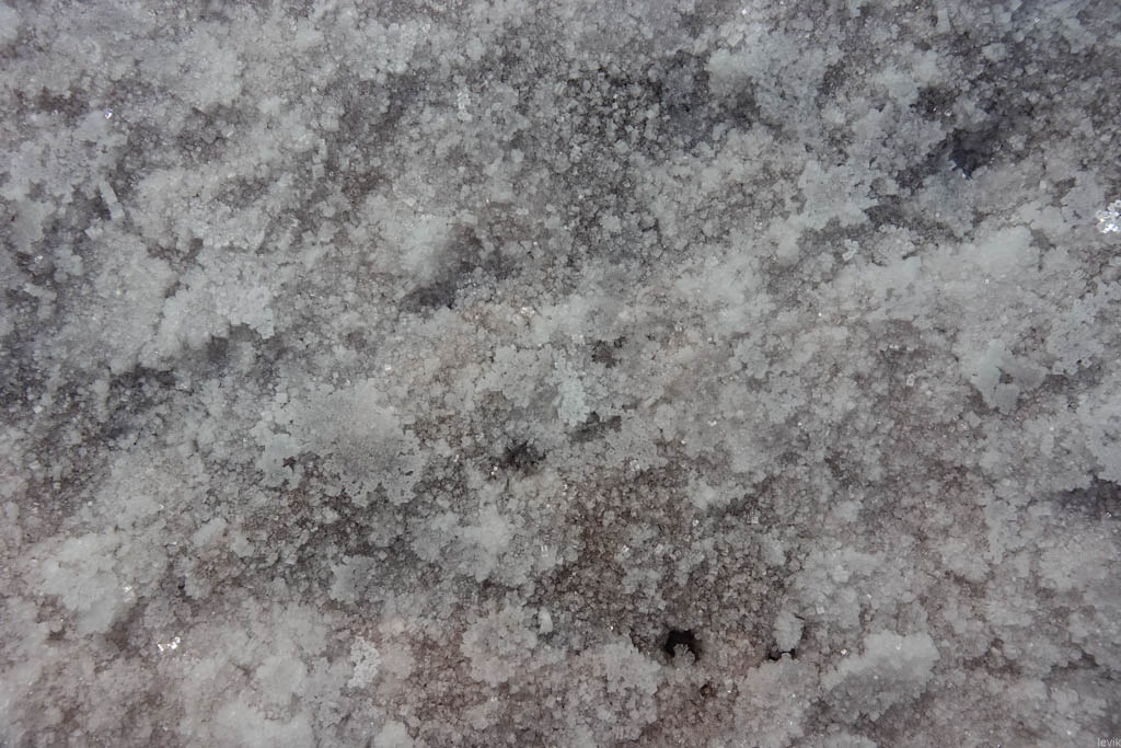 3. Толщина солевого слоя здесь - несколько метров. На самой поверхности кристаллы мелкие, и плотно упакованы, а ниже становятся крупнее и зернистее.