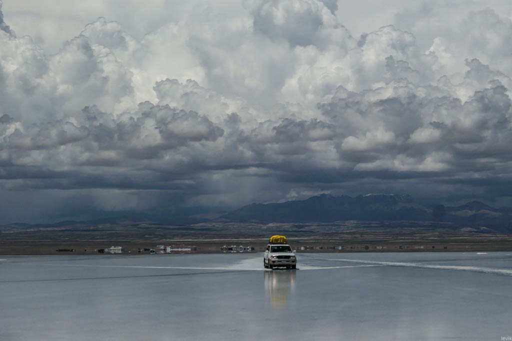 11. Однако на скорости видно, что от машины в разные стороны разлетаются брызги солёной воды. Вообще фотографии джипов на поверхности этого зеркала, на фоне неба и гор - это самые удачные кадры. В этом посте таких немало, а это я ещё заставил себя многие отсеять!